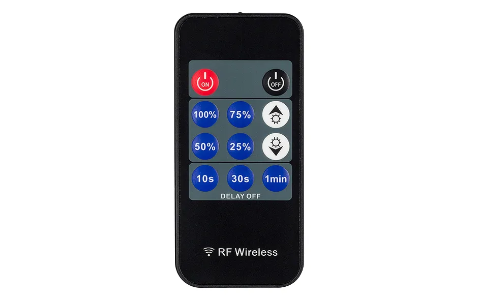 Диммер с черным тонким радиопультом. Питание 12-24V, 216-432W, 6A/канал, 3 синхронных (параллельных) канала. Размеры 83x82x33 мм. Заменяется на 025109.