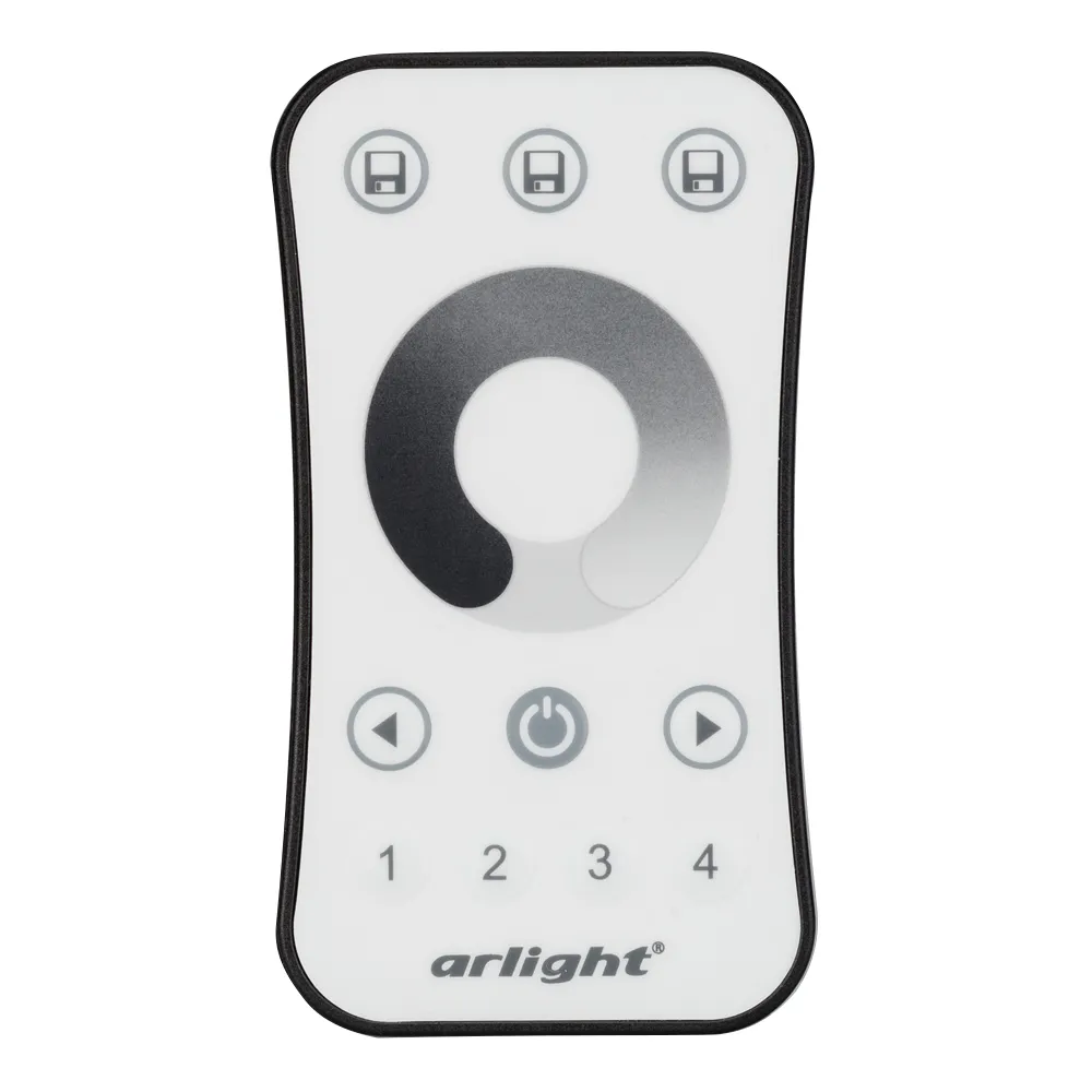 Кнопочный радиопульт с сенсорным кольцом 2.4 ГГц белого цвета для управления одноцветным (DIM) источником света. 4 зоны управления, управление яркостью с помощью сенсорного кольца. Питание 3VDC (CR2032). Габариты 107x58.5x9 мм. Управляет контроллерами и панелями серии SMART (поставляются отдельно). Настенные держатели приобретаются отдельно (см. аксессуары).