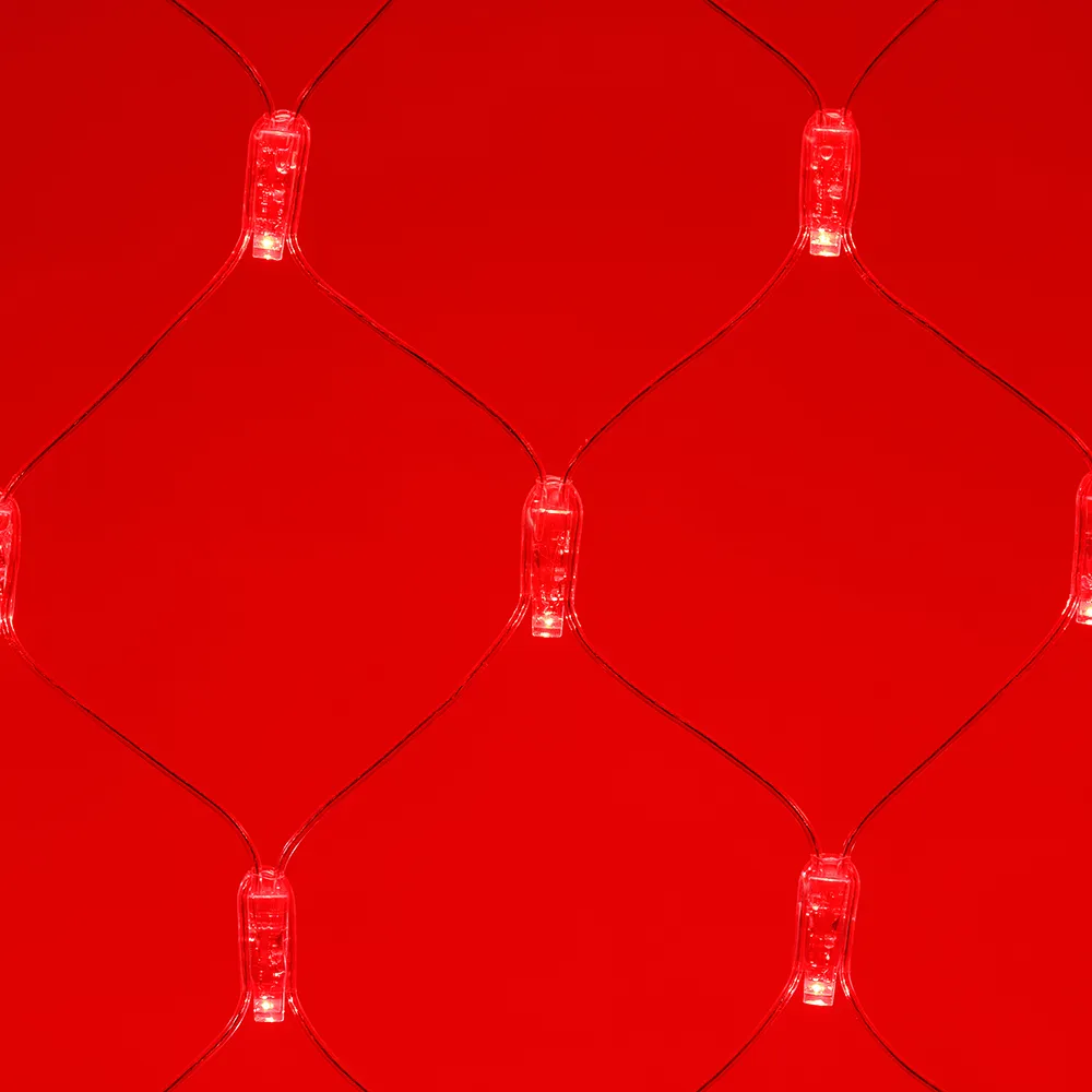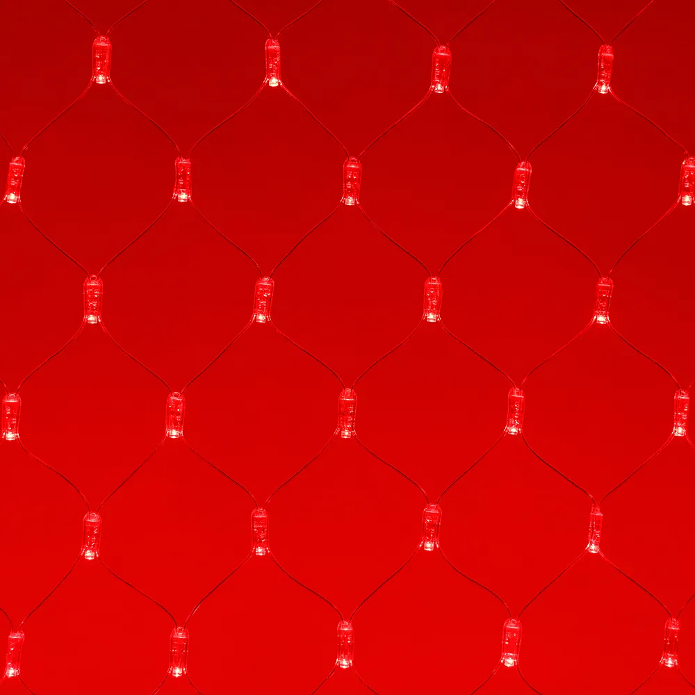 Светодиодная сеть Classic. 2000x1500 (длина 2000 мм, высота 1500 мм). Цвет свечения КРАСНЫЙ. 288 светодиодов размером 7 мм со статическим и 8 динамическими эффектами свечения с резким световым рисунком (прозрачная вогнутая линза). Провод прозрачный, ПВХ. Питание 230 В, Мощность 18 Вт,защита IP65, применение в помещении и на улице под навесом Аксессуары для подключения и выбора режима свечения в комплекте.