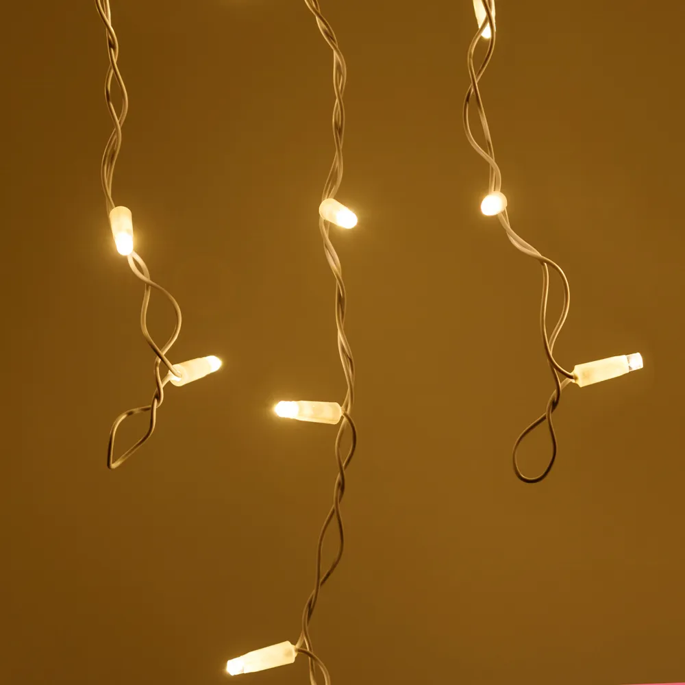 Светодиодная бахрома Classic. Размер 4000x600 мм (длина 4000 мм, по длине 24 нити высотой 200/600 мм). Количество светодиодов 128 шт размером 7 мм. Цвет свечения ТЕПЛЫЙ БЕЛЫЙ (3000 К), эффект постоянного свечения с резким световым рисунком (прозрачная вогнутая линза). Провод белый, каучук. Питание 230 В, Мощность 8 Вт, защита IP65, применение на улице под навесом. Аксессуары для подключения приобретаются отдельно.