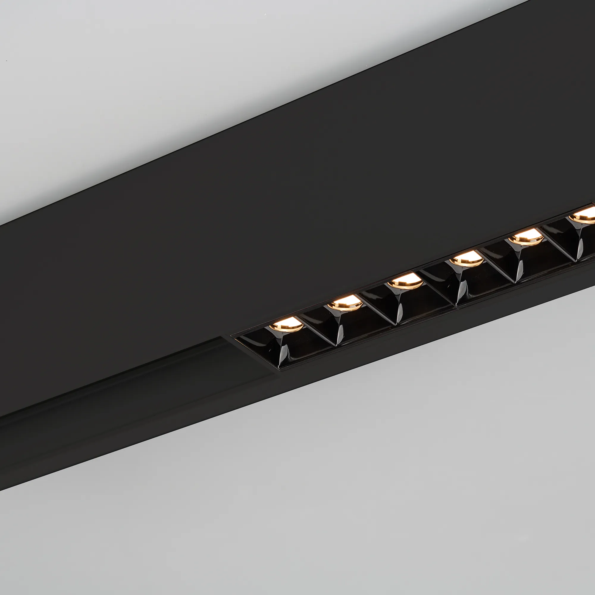 Светильник для магнитных треков шириной 45мм, 6Вт. Цвет свечения ДНЕВНОЙ 4000K, световой поток 455лм, угол 15°, CRI>90. Корпус прямоугольный, металл, цвет черный, IP20. Размеры LxWxH 163x35x43мм. Входное напряжение DC24V, мощность 6Вт. Драйвер DС24V/AC230V поставляется отдельно. Диммируется только с 026407(1), 027633.