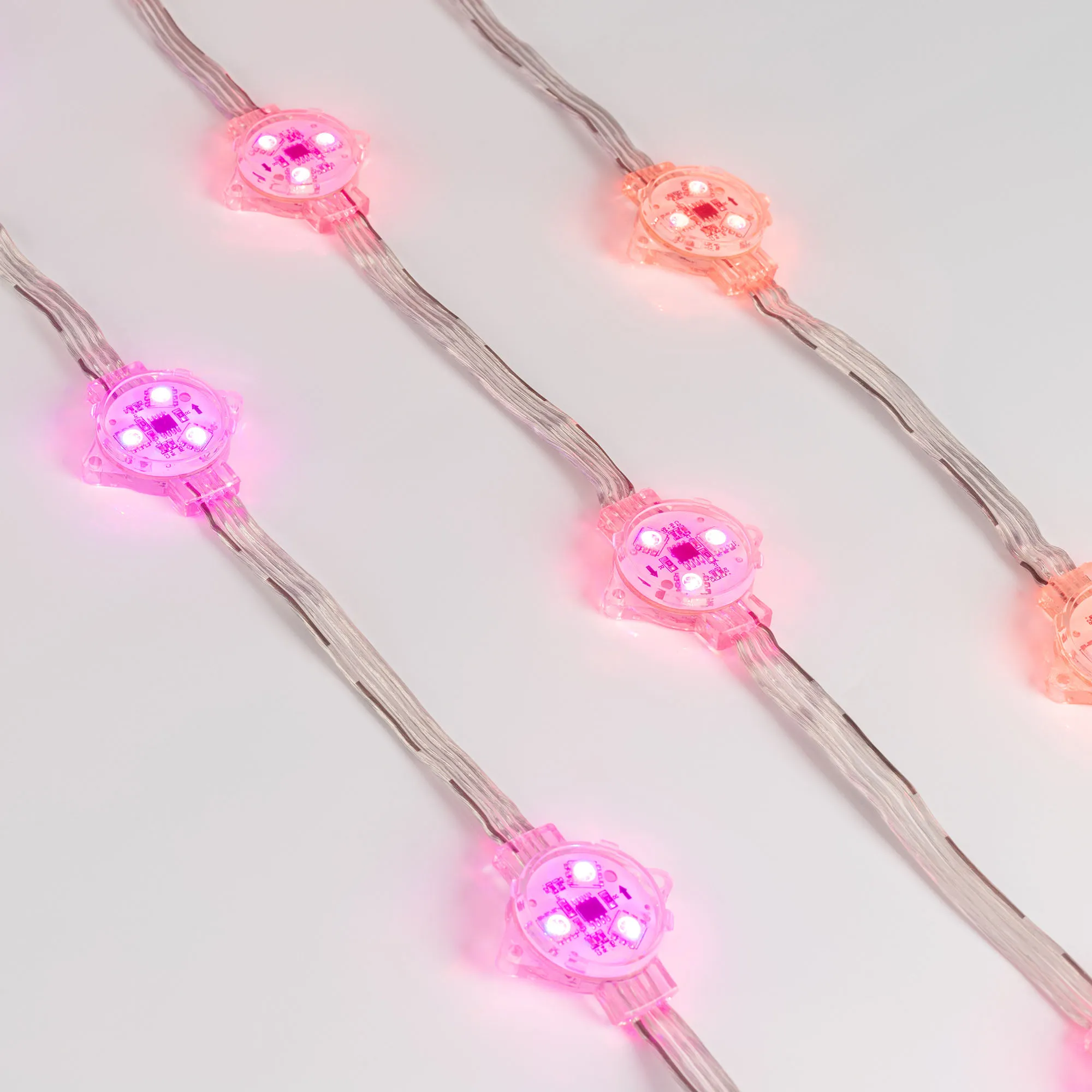 Управляемый светодиодный модуль SPI с держателем, RGB, микросхема SM16703, напряжение 12 В, мощность 0.75 Вт, 3 светодиода SMD 5060, угол 120°. Создание медиафасадов. Функция обхода битого пикселя. 20 шт на проводе, расстояние между центрами модулей 150 мм, длина провода между модулями 120 мм. IP 68. Размер Ø30×11.2 мм. Гарантия 3 года. В комплекте инжектор питания.