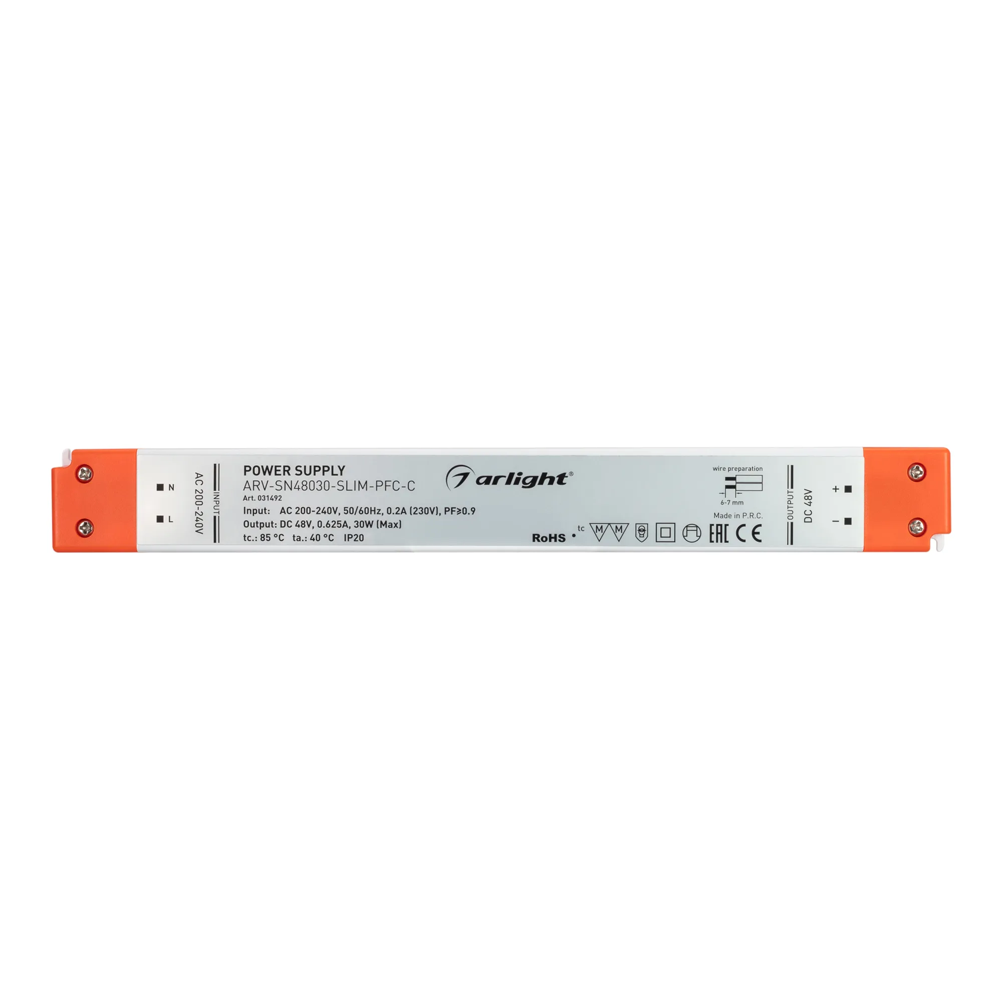 Источник напряжения с гальванической развязкой для светодиодных изделий. Входное напряжение 200-240 VAC. Выходные параметры: 48 В, 0.62 А, 30 Вт. Встроенный PFC >0,9. Сверхтонкий пластиковый корпус IP 20. Габаритные размеры длина 251 мм, ширина 30 мм, высота 16 мм. Гарантийный срок 3 года.