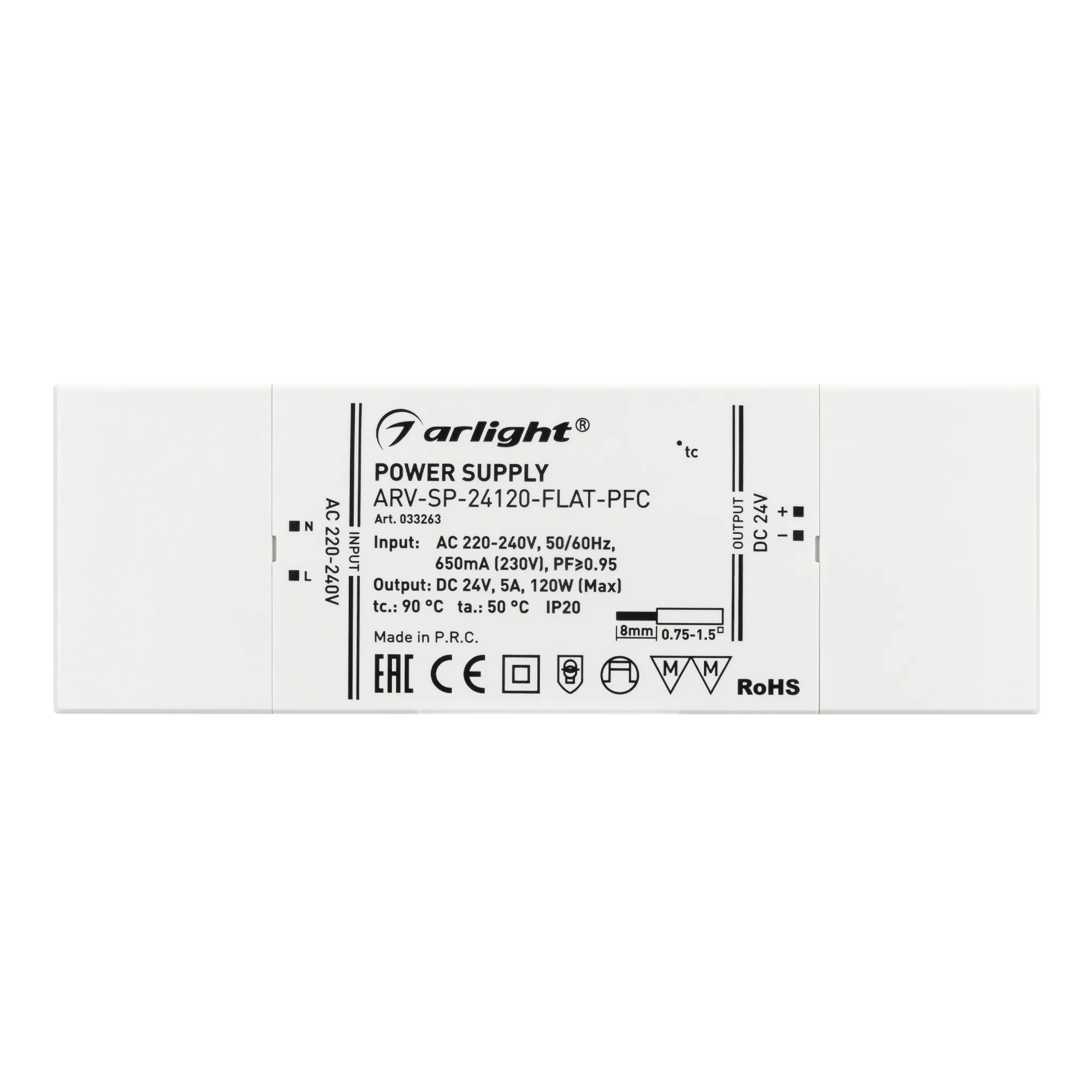 Источник напряжения с гальванической развязкой для светодиодных изделий. Входное напряжение 220-240 VAC. Выходные параметры: 24 В, 5 А, 120 Вт. Встроенный PFC >0.95. Сверхтонкий пластиковый корпус IP20. Габаритные размеры длина 190 мм, ширина 65 мм, высота 22 мм. Гарантийный срок 5 лет.