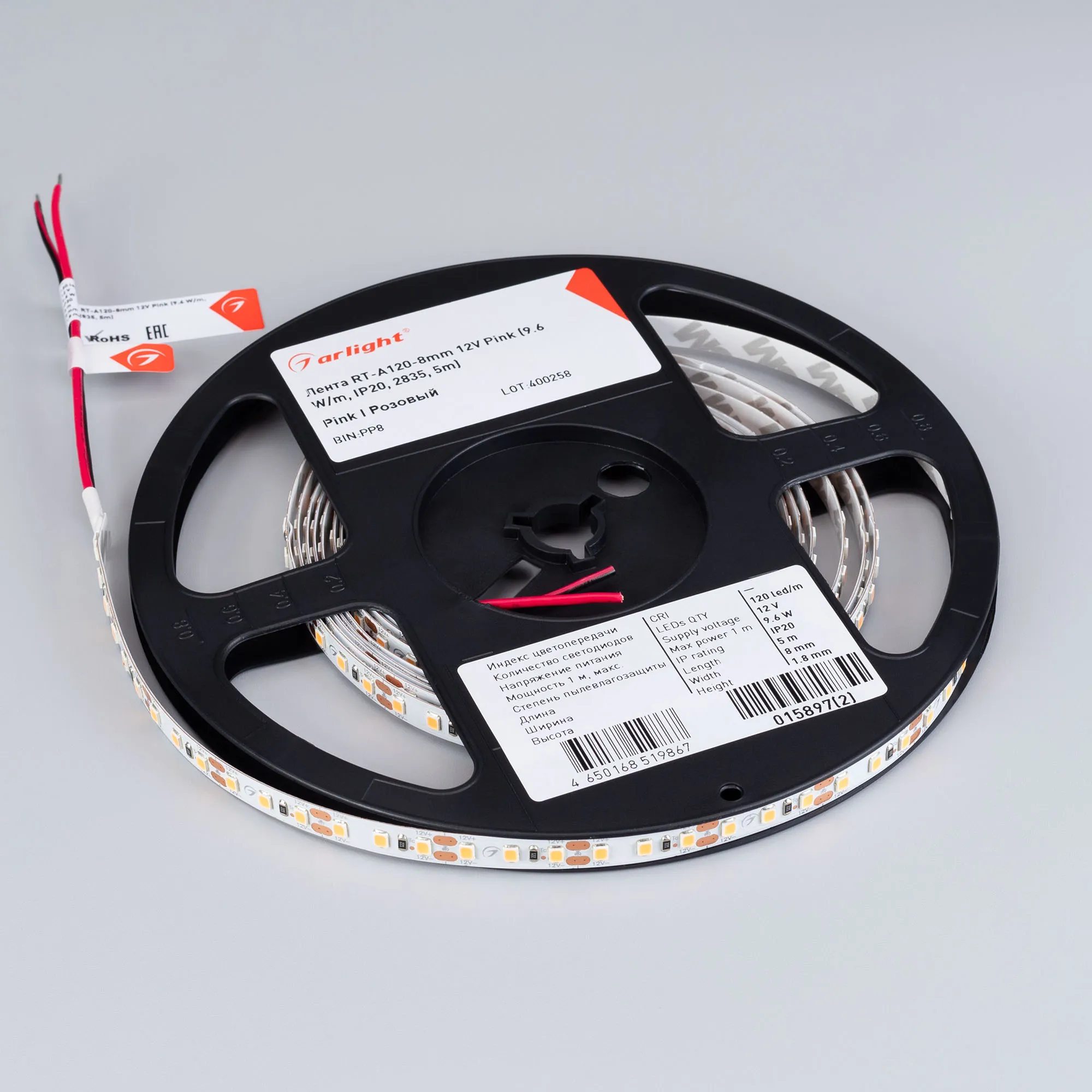 Лента светодиодная RT-A120-8mm 12V Pink (9.6 W/m, IP20, 2835, 5m) (Arlight, Открытый)