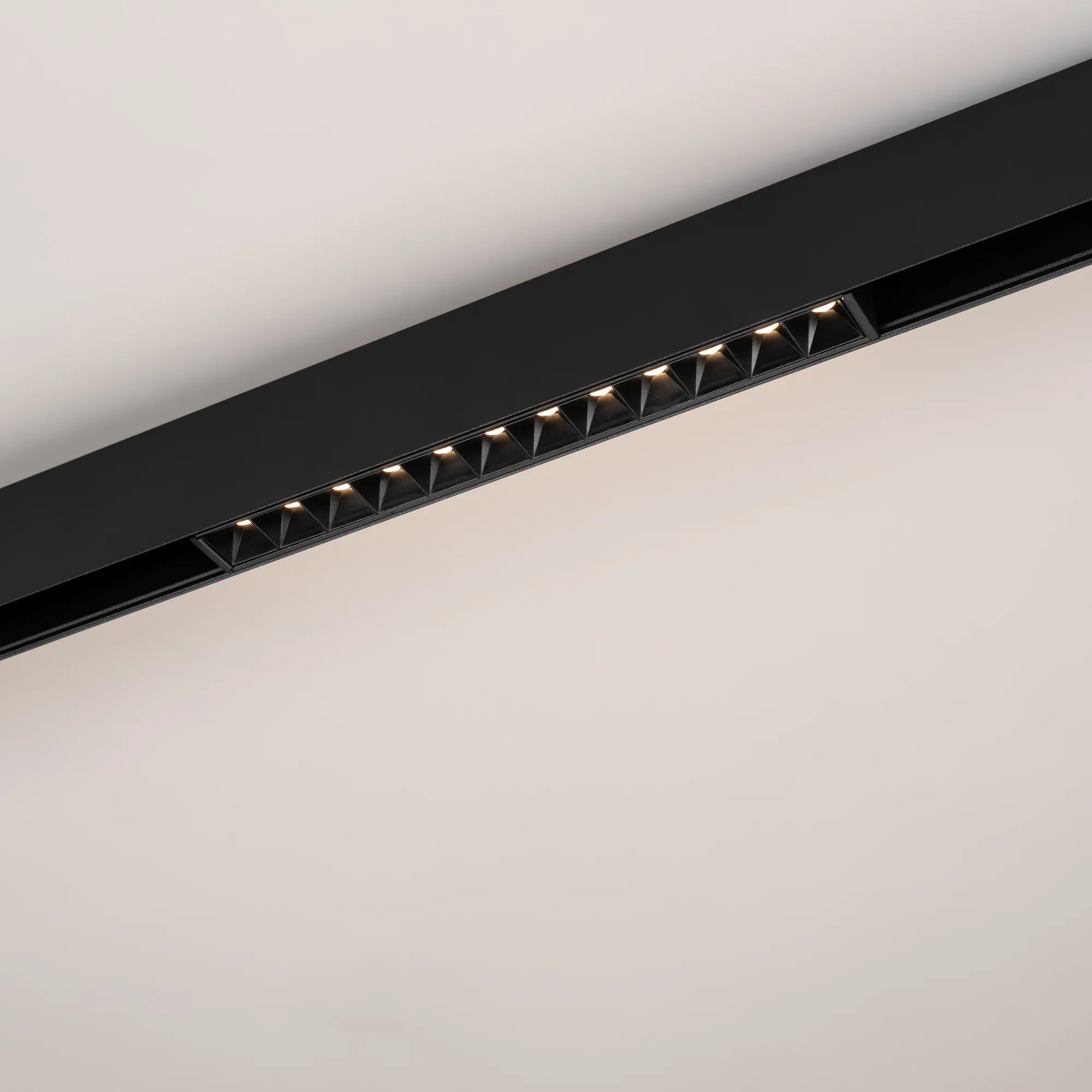 Светильник для магнитных треков MAG-ORIENT шириной 26 мм с управлением DALI. Мощность 8 Вт, св. поток 460 лм, 58 лм/Вт, дневной 4000 K, CRI>90, угол 24°, напряжение питания 48 В. Черный прямоугольный корпус из металл, экран поликарбонат, степень защиты IP20. Размер: длина 235 мм, ширина 22 мм, высота 42 мм. Монтаж на трек MAG-ORIENT. Пульсация <1%.