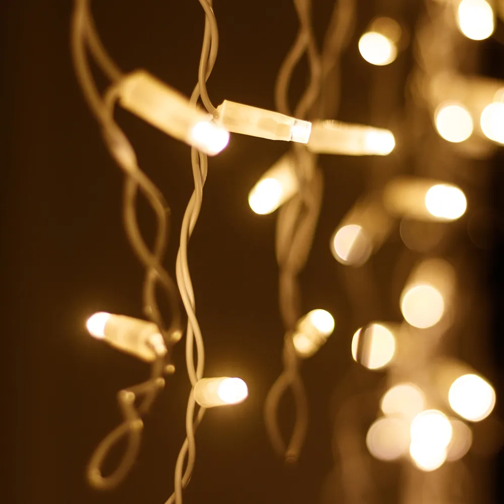 Светодиодная бахрома Pro. Размер 4000x600 мм (длина 4000 мм, по длине 32 нити высотой 200/600 мм). Количество светодиодов 128 шт размером 7 мм. Цвет свечения ТЕПЛЫЙ БЕЛЫЙ (3000 К), эффект постоянного свечения с мягким световым рисунком (выпуклая молочно-белая линза). Провод белый, резиновый. Питание 230 В, Мощность 8 Вт, защита IP65, применение на улице под навесом. Аксессуары для подключения приобретаются отдельно.