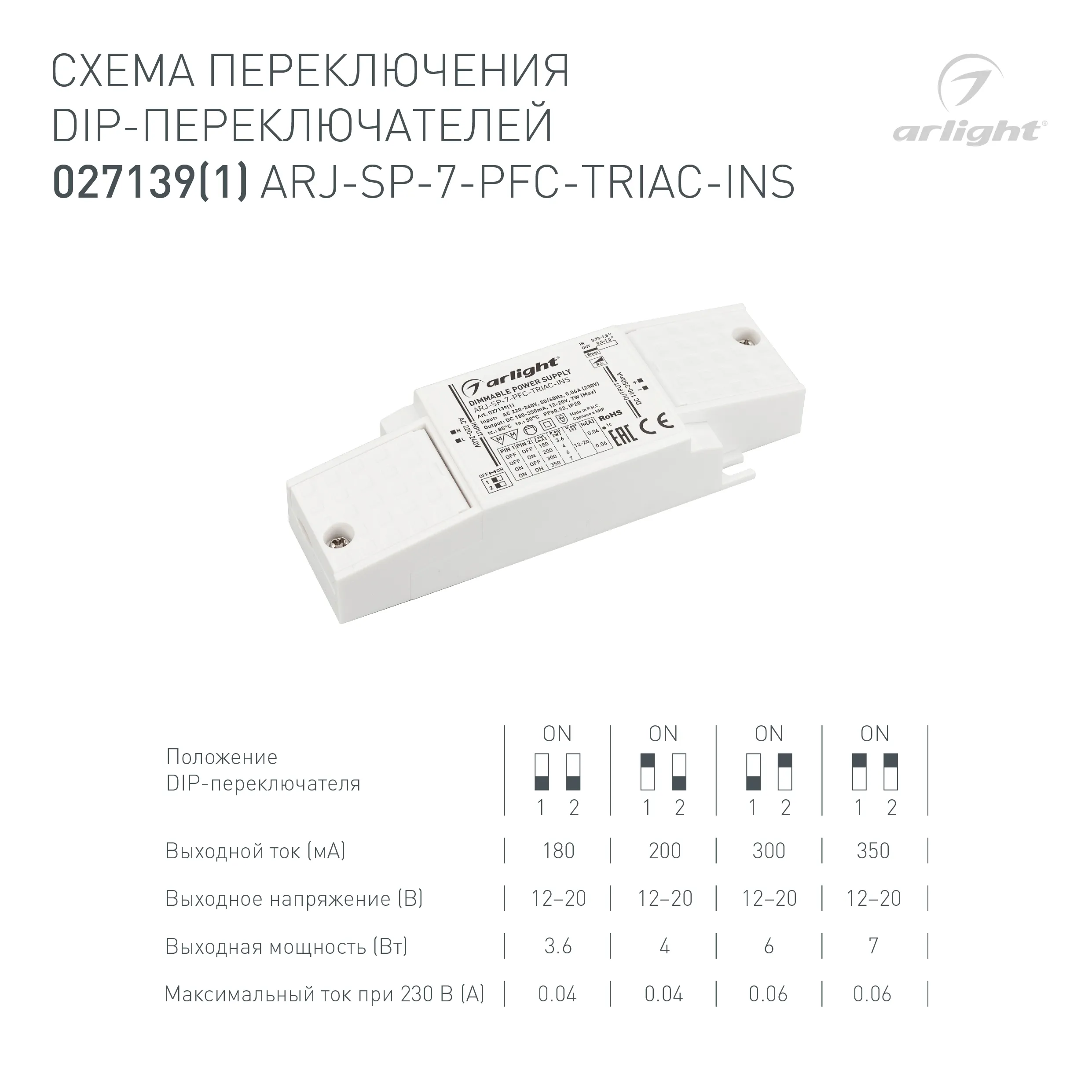 Блок питания ARJ-SP-7-PFC-TRIAC-INS (7W, 12-20V, 0.18-0.35A) (Arlight, IP20 Пластик, 5 лет)
