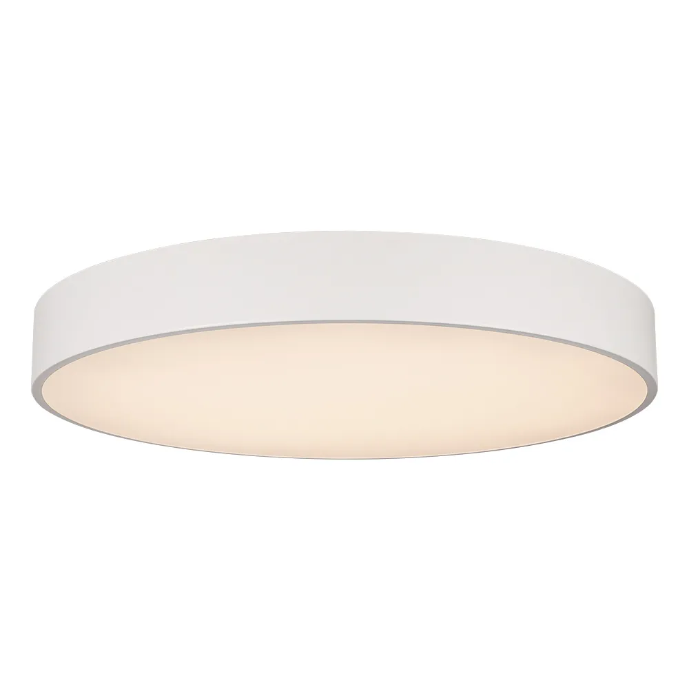 Накладной интерьерный светильник. Мощность 94 Вт, св. поток 8460 лм, 90 лм/Вт, теплый 3000 K, CRI>80, угол 120°, напряжение питания 230 В. Белый круглый корпус из алюминия, степень защиты IP20. Размер: диаметр 800 мм, высота 100 мм. Монтаж накладной. Драйвер 28-42 В, 1200 мА (2 шт.), пульсация <5%.