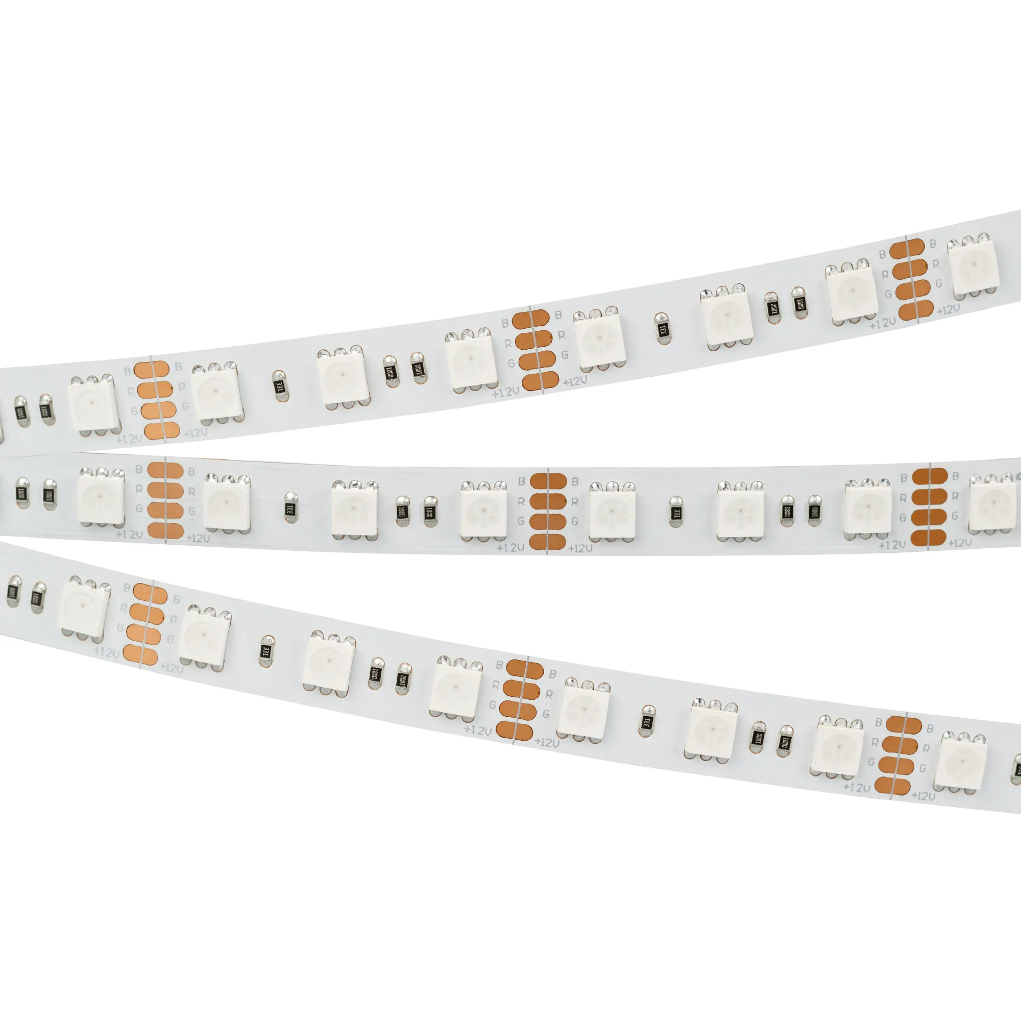 Мультицветная светодиодная лента RT серии B72. Светодиоды SMD 5060, 72 шт/м (360 шт на 5 м), белая плата шириной 10 мм, скотч 3M. Цвет RGB, угол 120°. Питание 12 В, мощность 15 Вт/м (75 Вт на 5 м). Размеры 5000x10x2.2 мм. Мин. отрезок 41.7 мм, 3 светодиода. Цена за 1 м.