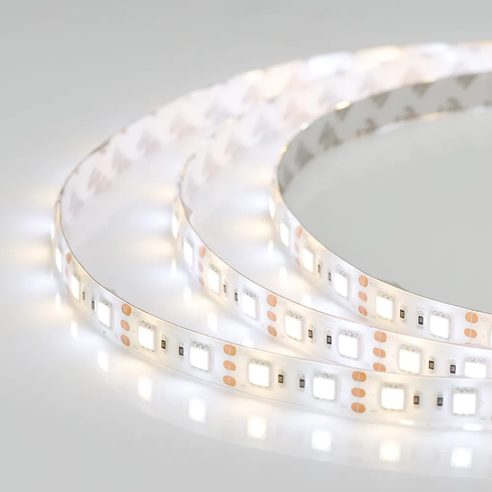 Светодиодная герметичная лента RTW серии B60 с изменяемым цветом свечения, IP65 (SE - силиконовый верхний слой). Светодиоды SMD 5060, 60 шт/м, белая плата шириной 12 мм, скотч 3M. Цвет MIX БЕЛЫЙ 6000K + ТЕПЛЫЙ 3000K, индекс цветопередачи CRI>85, угол 120°. Питание 12 В, мощность 14.4 Вт/м (72 Вт на 5 м). Размеры 5000x12x2.7 мм. Мин. отрезок 33.33 мм, 2 светодиода. Цена за 1 м.