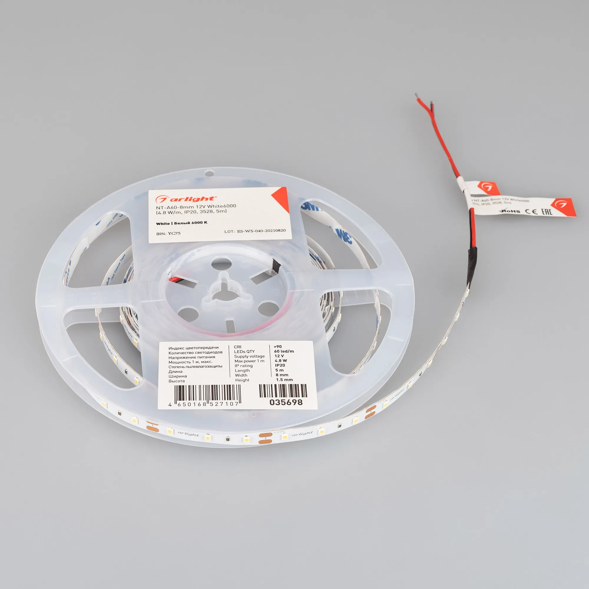 Светодиодная лента NT серии A60. Светодиоды SMD 3528, 60 шт/м, белая плата шириной 8 мм, скотч 3M. Цвет БЕЛЫЙ 6000K, индекс цветопередачи CRI>90, угол 120°. Питание 12 В, мощность 4.8 Вт/м (24 Вт на 5 м). Размеры 5000x8x1.5 мм. Мин. отрезок 50 мм, 3 светодиода. Цена за 1 м.