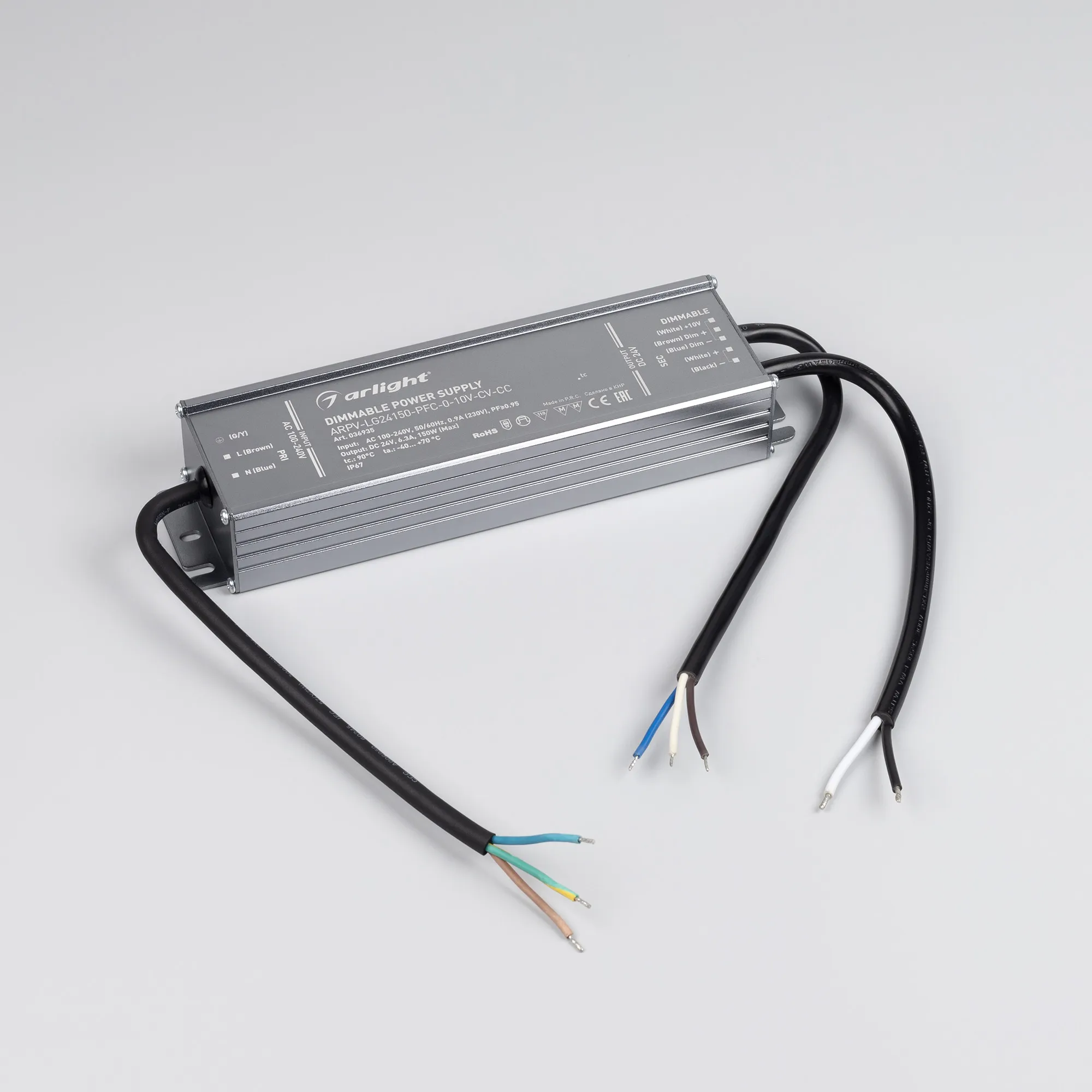 Диммируемый источник напряжения с переходом в режим источника тока по стандарту 1-10 В без полного гашения (также доступно диммирование с помощью резистора 10кОм) с гальванической развязкой для светодиодных изделий. Входное напряжение 100-240 VAC. Выходные параметры: 24 В (не ШИМ), 6,3А, 150 Вт. Встроенный PFC >0.95. Герметичный алюминиевый корпус IP 67. Рабочая температура -40…+70C⁰. Габаритные размеры длина 221мм, ширина 62 мм, высота 37 мм. Гарантийный срок 5 лет.