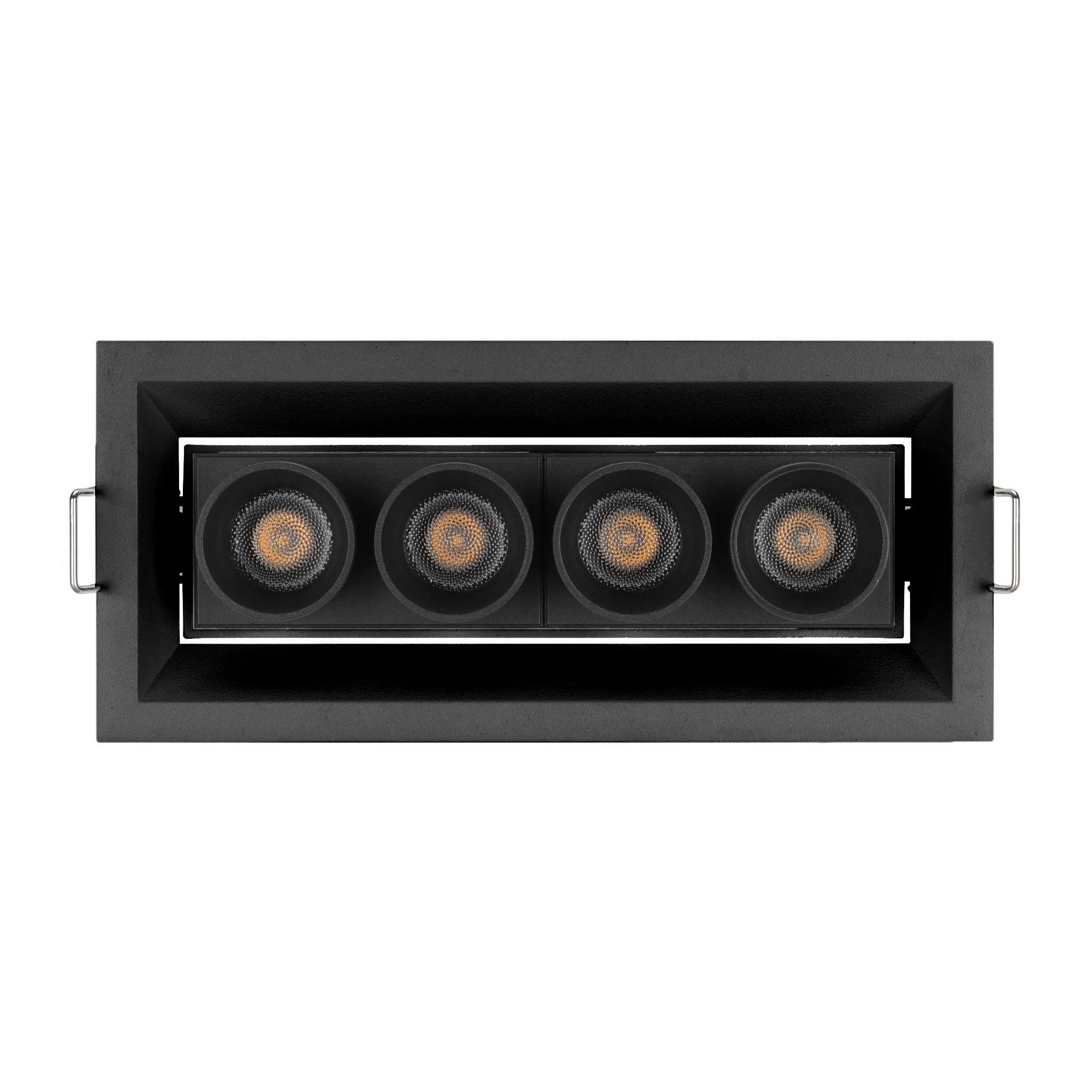 Встраиваемый поворотный светильник. Мощность 10 Вт, св. поток 734 лм, 75 лм/Вт, дневной 4000 K, CRI>98, угол 30°, напряжение питания 230 В. Чёрный прямоугольный корпус из алюминия, экран PMMA, степень защиты IP20. Размер: длина 150 мм, ширина 67 мм, высота 50 мм. Монтаж встраиваемый, установочное отверстие длина 145 мм, ширина 60 мм. Драйвер 9-14 В, 700 мА, пульсация <1%.