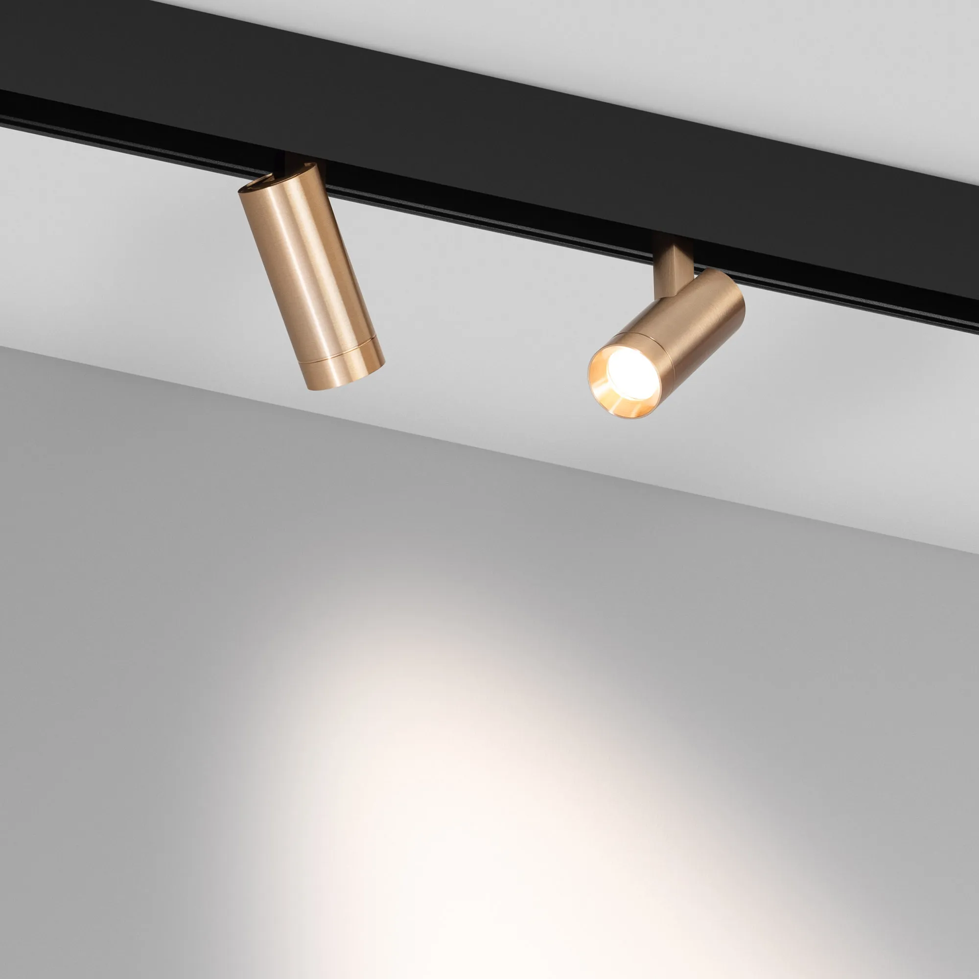 Светильник для магнитных треков MAG-ORIENT шириной 26 мм. Мощность 6 Вт, св. поток 555лм, 92 лм/Вт, дневной 4000 K, CRI>904 угол 24°, напряжение питания 48 В. Золотой фигурный корпус из металл, экран поликарбонат, степень защиты IP20.Размеры LxWxH 204x35x132 мм. Длина светоизлучающего модуля 85 мм. Монтаж на трек MAG-ORIENT. Пульсация <1%.