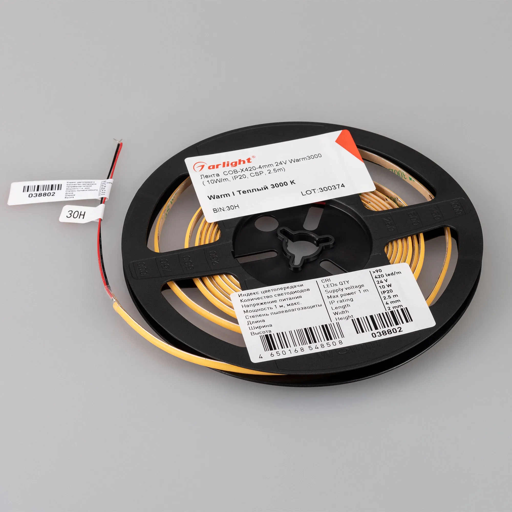 Лента светодиодная COB-X420-4mm 24V Warm3000 (10 W/m, IP20, CSP, 5m) (Arlight, узкая)