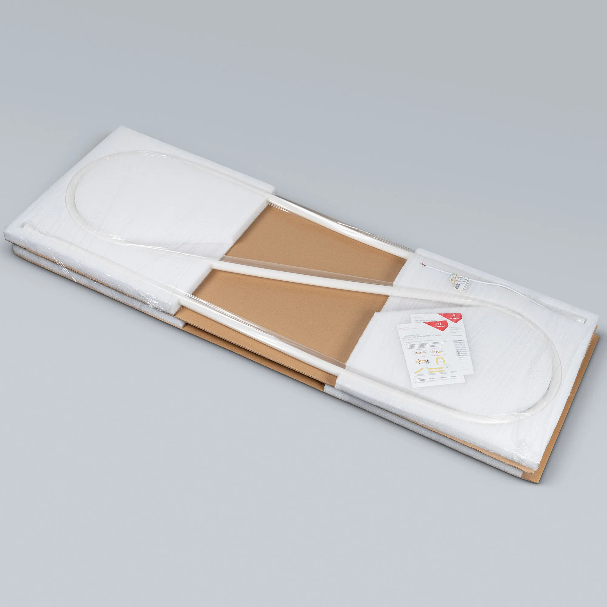 Гибкая герметичная лента (неон серии MOONLIGHT), сечение 25×25 мм. Светодиоды CSP 1088 шт/м. Цвет свечения ТЕПЛЫЙ БЕЛЫЙ (2300 К), индекс цветопередачи CRI>90, световой поток 920 лм/м, угол излучения 360°. Мощность 20 Вт/м, питание 24 В. Класс пылевлагозащиты IP65. Размеры 5000×25×25 мм. Резка не предусмотрена. Форма изгиба ленты фиксируется. Изгиб согласно метки на корпусе, минимальный радиус изгиба 150 мм. Кабель питания длиной 500 мм, вывод с одной стороны вдоль линии сечения неона. Катушка 5 м. Цена за 1 м. В виду особенности конструкции ленты, упаковка имеет размеры 1600x980x260 мм. Гарантия 3 года.