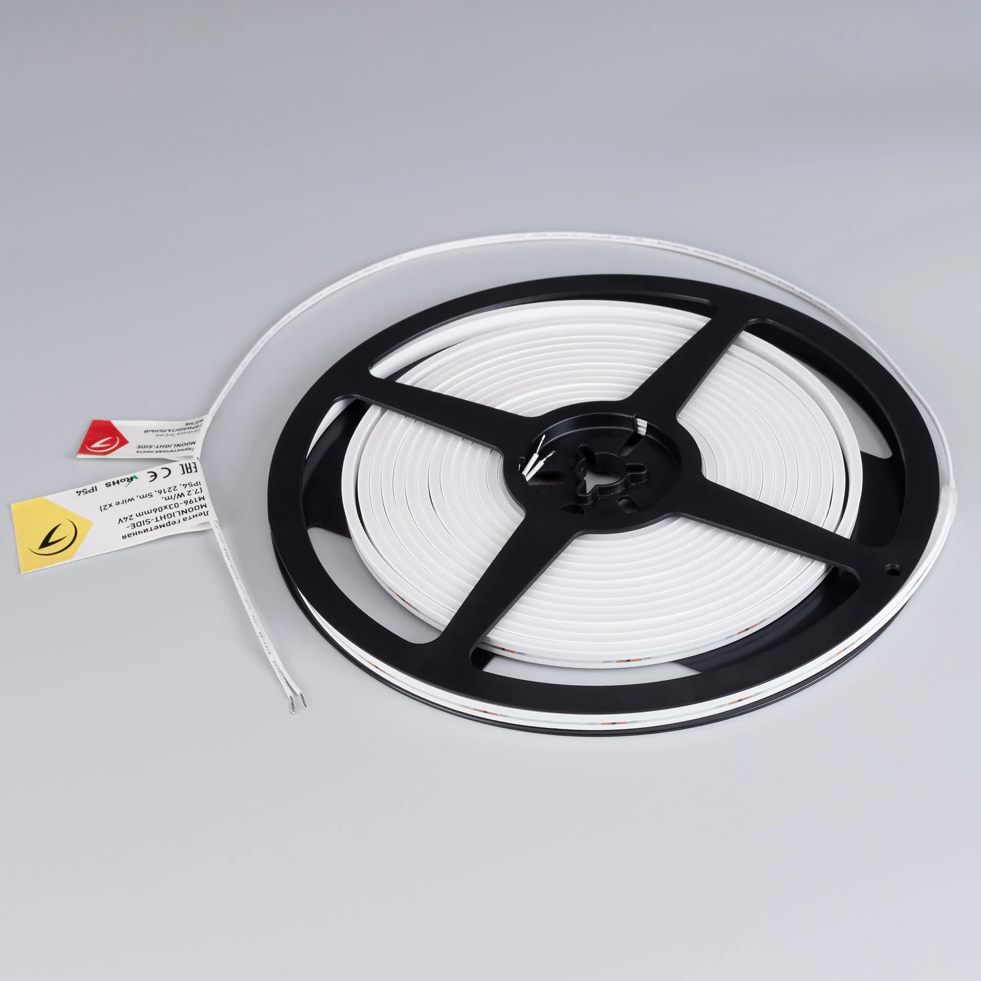 Гибкая герметичная лента (неон серии MOONLIGHT), сечение 3×6 мм. Светодиоды SMD 2216 196 шт/м. Цвет свечения ДНЕВНОЙ (4000 К), индекс цветопередачи CRI>90, световой поток 200 лм/м, угол излучения 112°. Мощность 7.2 Вт/м, питание 24 В. Класс пылевлагозащиты IP54. Размеры 5000×3×6 мм. Мин. отрезок 35.7 мм. Горизонтальный изгиб SIDE, минимальный радиус изгиба 30 мм. Кабель питания длиной 500 мм, вывод с двух сторон вдоль линии сечения неона. Катушка 5 м. Цена за 1 м. Гарантия 3 года.