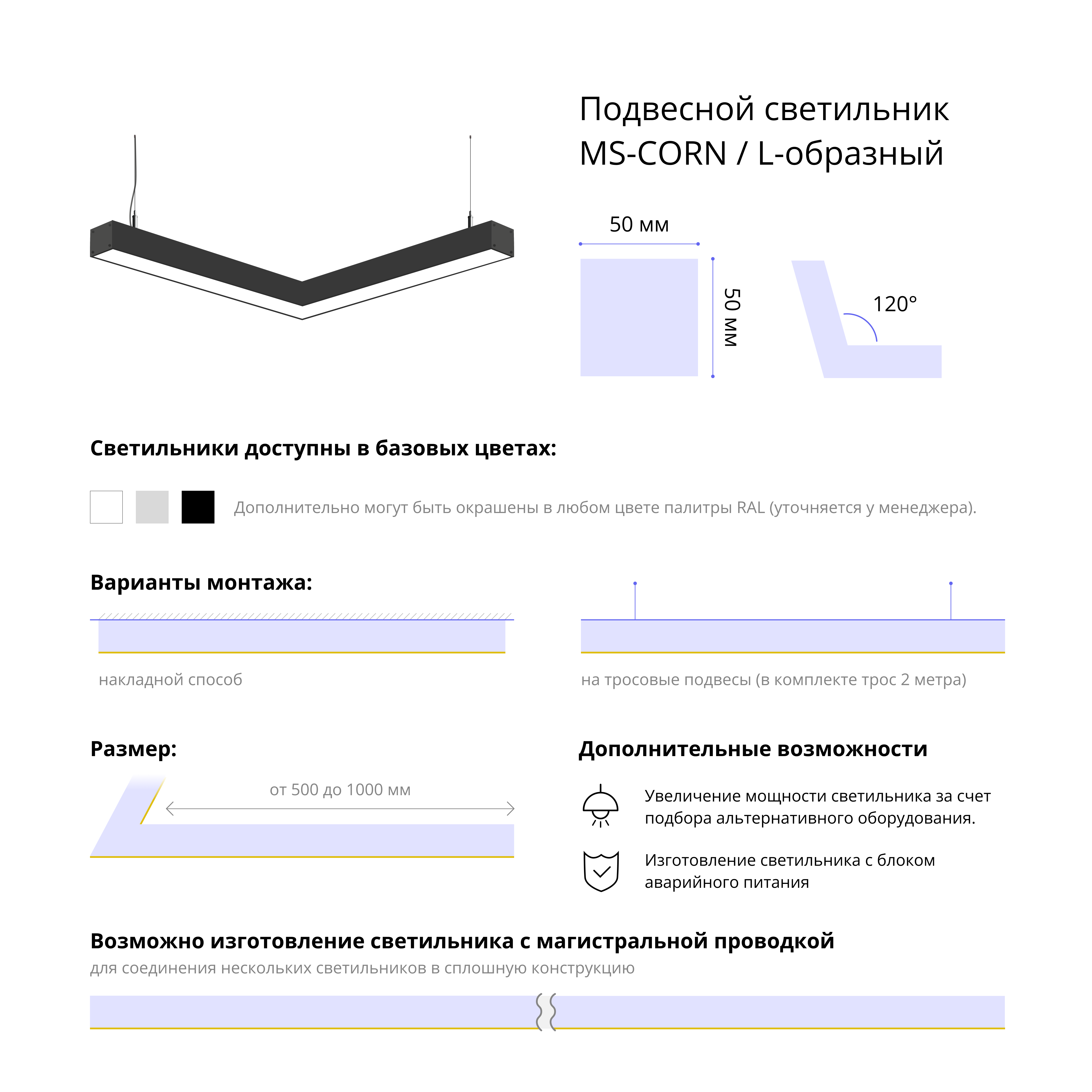Светодиодный фигурный светильник MS-CORN L-образный 120гр. размер профиля 50х50mm длиной 1000х100mm мощностью 40W. Светильник собирается в алюминиевом корпусе с матовым рассеивателем, который дает равномерную засветку по всей площади.