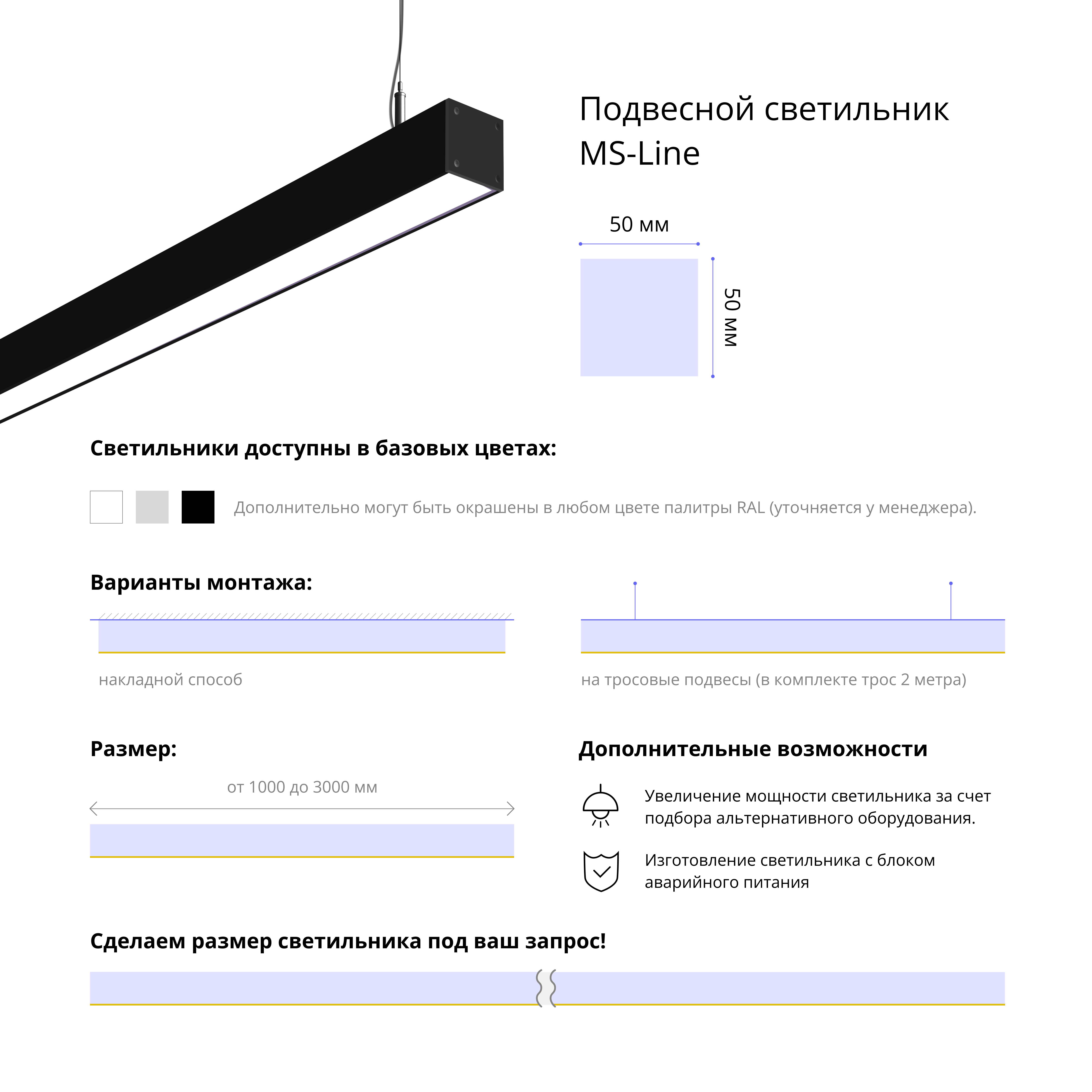 - Варианты монтажа: на тросовые подвесы (в комплекте трос 2 метра) и накладным способом.