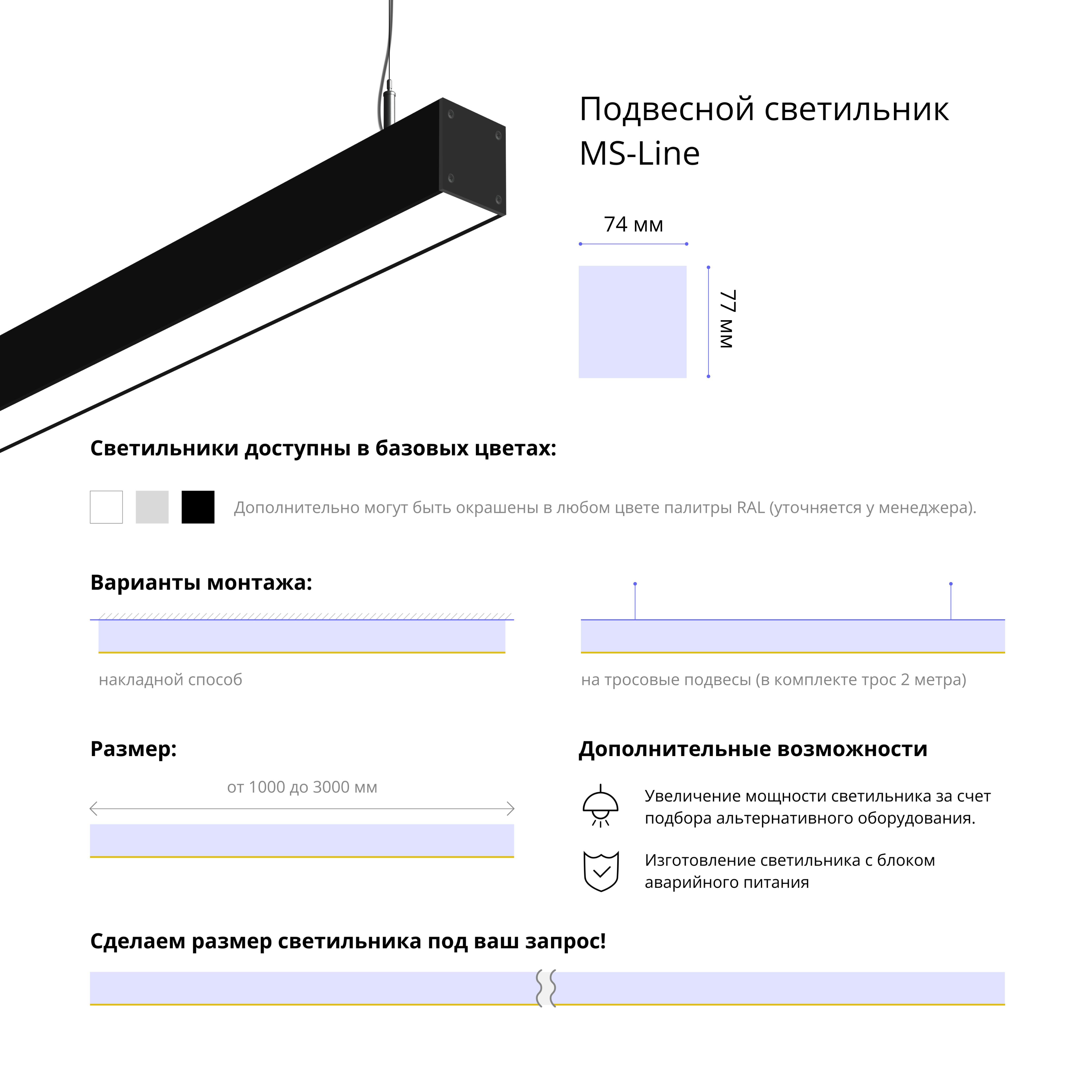 - Варианты монтажа: на тросовые подвесы (в комплекте трос 2 метра) и накладным способом.