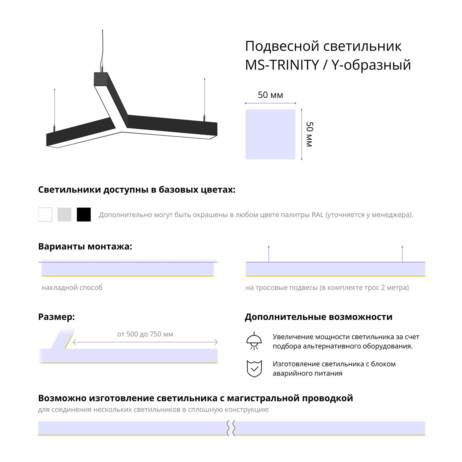 Cветодиодный фигурный светильник MS-TRINITY Y-образный размер профиля 50x50мм длиной 3х500мм мощностью 60W. Светильник собирается из алюминиевого основния с матовым рассеивателем, который дает равномерную засветку по всей площади.
