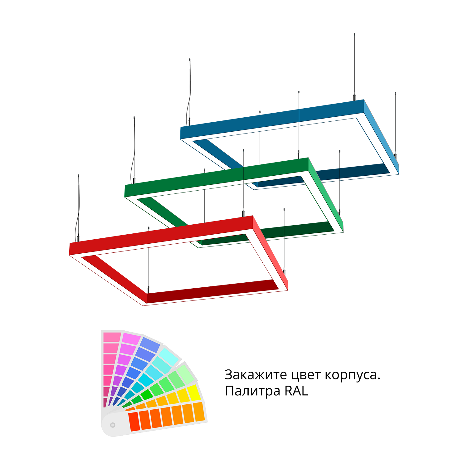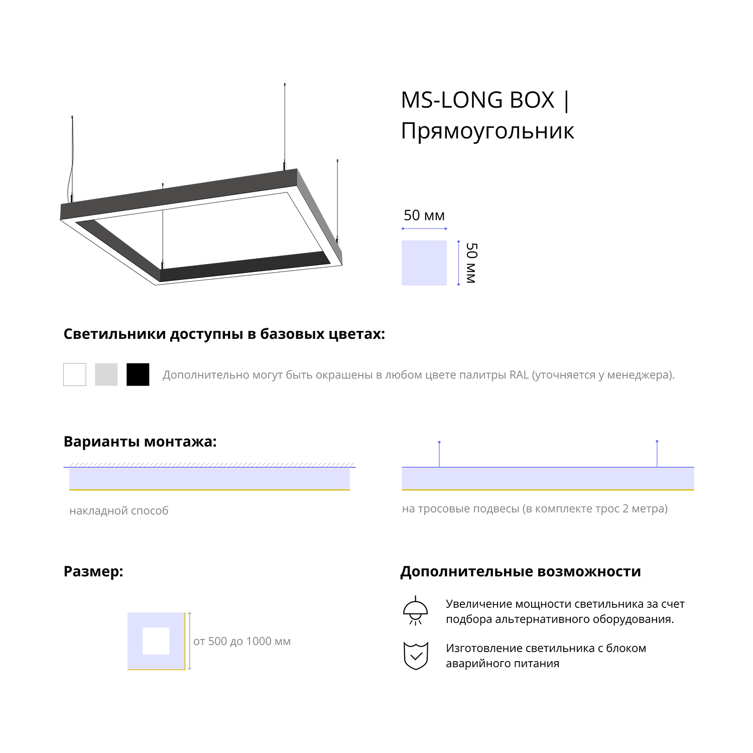Cветодиодный фигурный светильник MS-LONG BOX Квадрат размер профиля 50x50мм длиной 1000х1000мм мощностью 75W. Светильник собирается из алюминиевого основния с матовым рассеивателем, который дает равномерную засветку по всей площади.