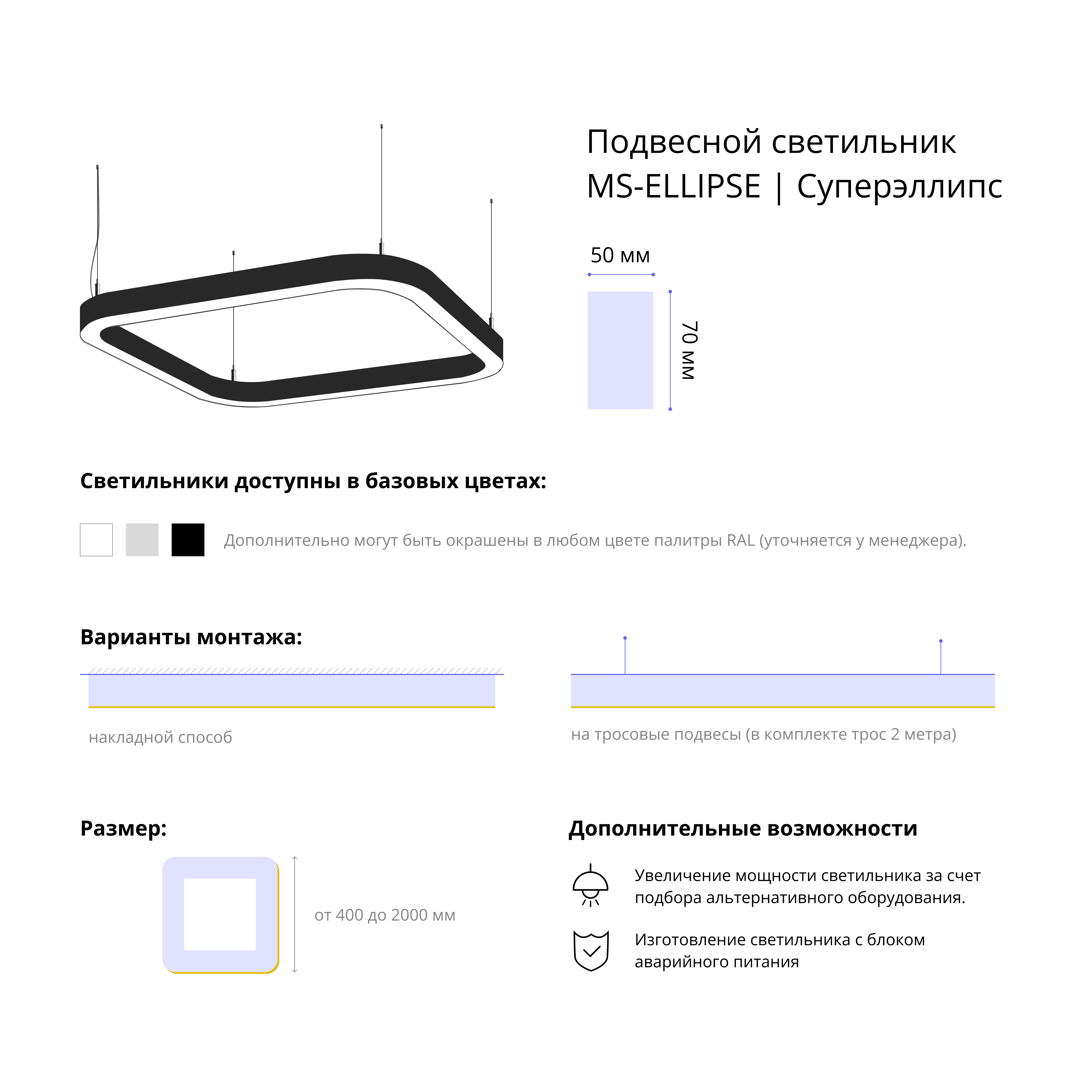 Cветодиодный фигурный светильник MS-ELLIPSE Суперэллипс размер профиля 70x50мм длиной 1900мм мощностью 114W. Светильник собирается из алюминиевого основния с матовым рассеивателем, который дает равномерную засветку по всей площади.