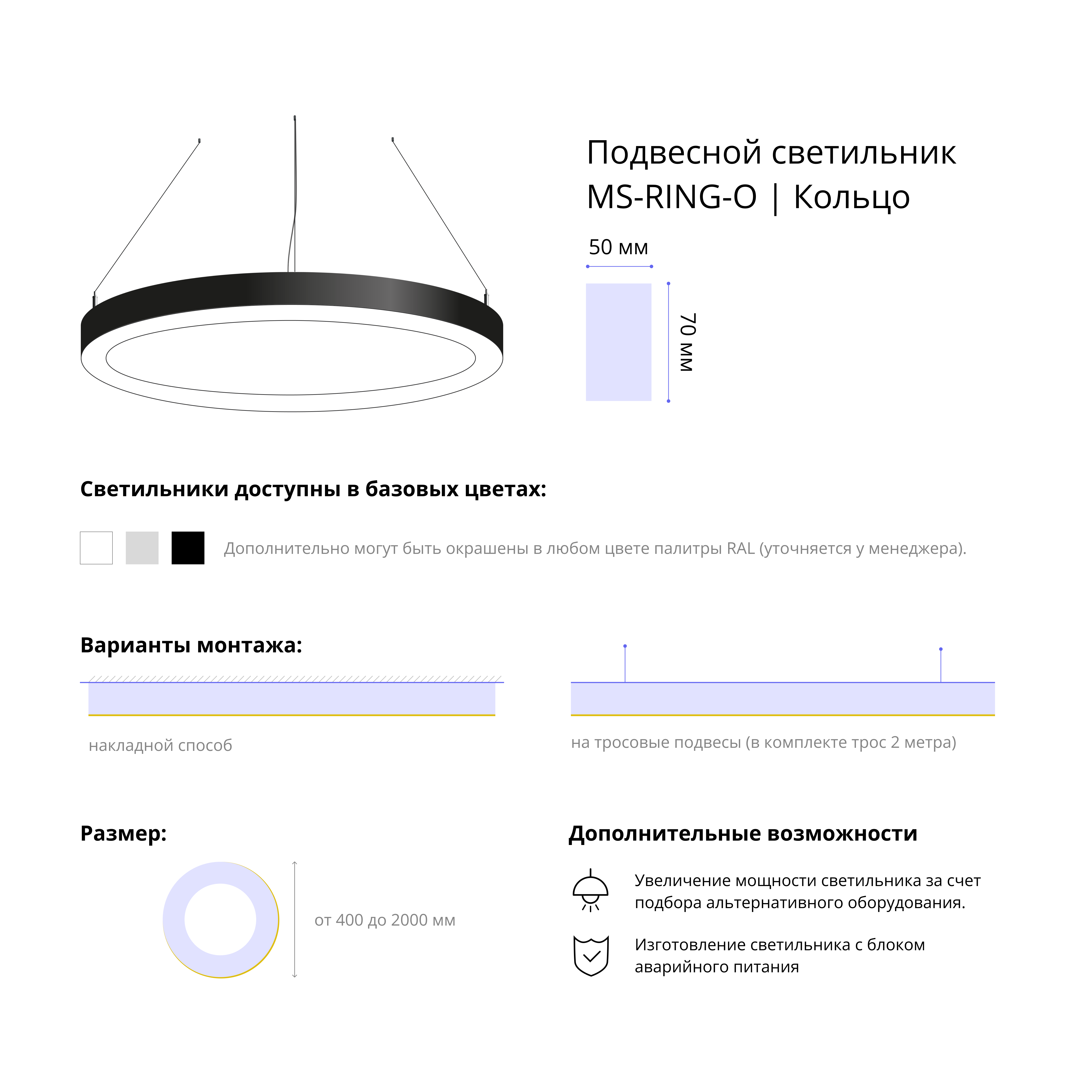 - Варианты монтажа: на тросовые подвесы (в комплекте трос 2 метра) и накладным способом.