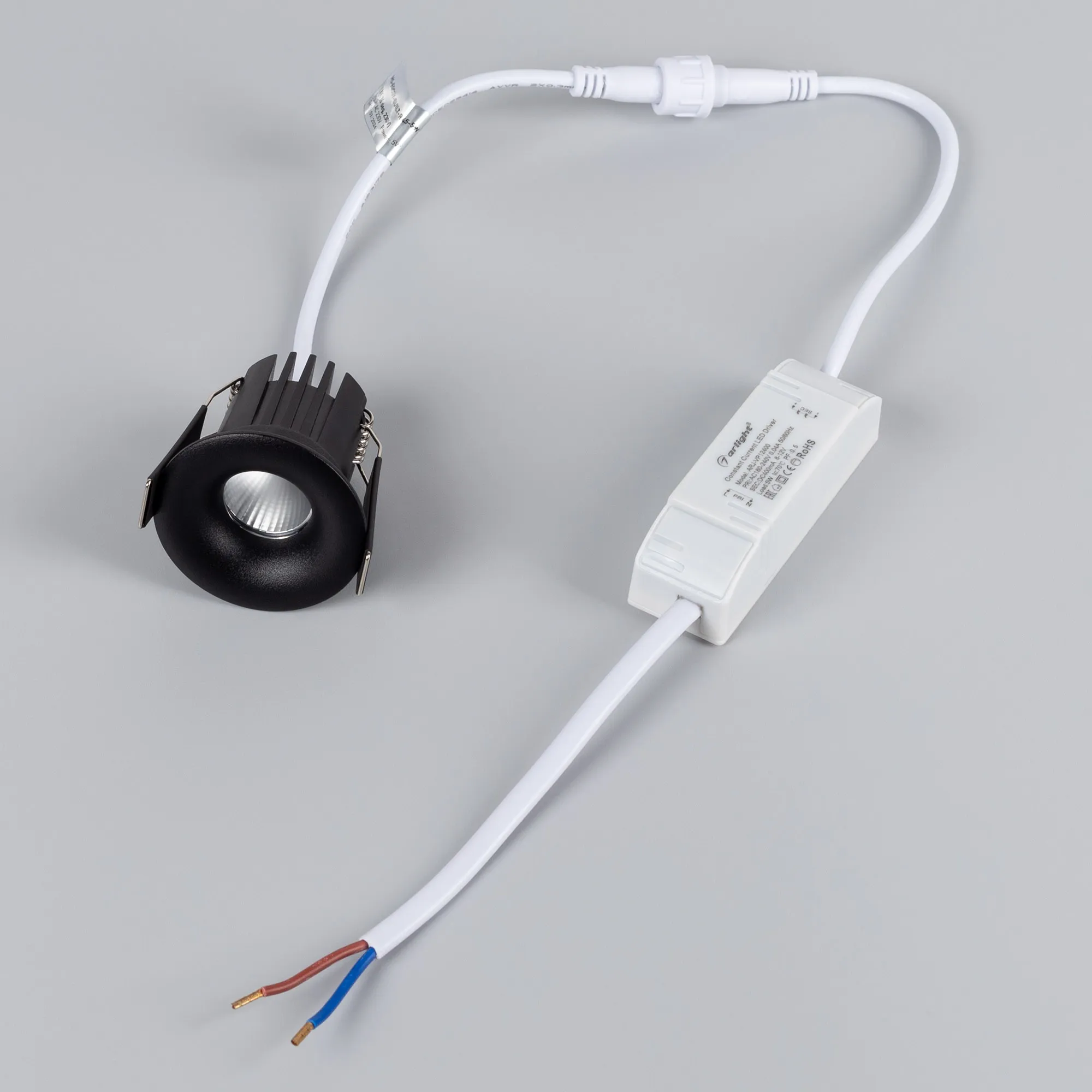 Встраиваемый светильник даунлайт. Мощность 5 Вт, св. поток 440 лм, 88 лм/Вт, дневной 4000 K, CRI>90, угол 36°, напряжение питания 230 В. Черный круглый корпус из алюминия, экран PMMA, степень защиты IP54. Размер: диаметр 45 мм, высота 43 мм. Монтаж встраиваемый, установочное отверстие: диаметр 35 мм. Драйвер IP54, 8-12 В, 400 мА, пульсация <1%.