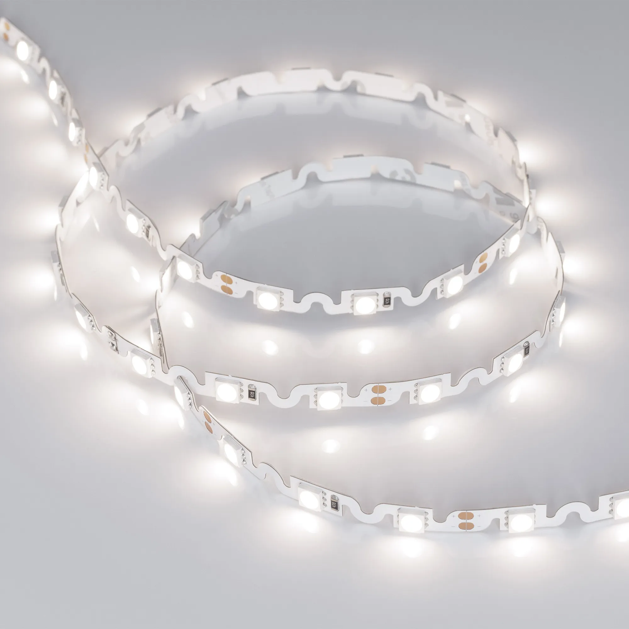 Гибкая лента с фигурной платой в форме волны, легко изгибается на плоскости. Светодиоды smd 5060, 48шт/м (240шт на 5м), белая плата 6.1мм, скотч 3М. Цвет ДНЕВНОЙ 3800-4200K. Питание 12V, мощность 11.5 Вт/м (57.5 Вт на 5м), угол 120°, цветопередача CRI>85. Размеры 5000х6.1х2.2мм. Мин.отрезок 62.5мм, 3 светодиода. Цена за 1м.