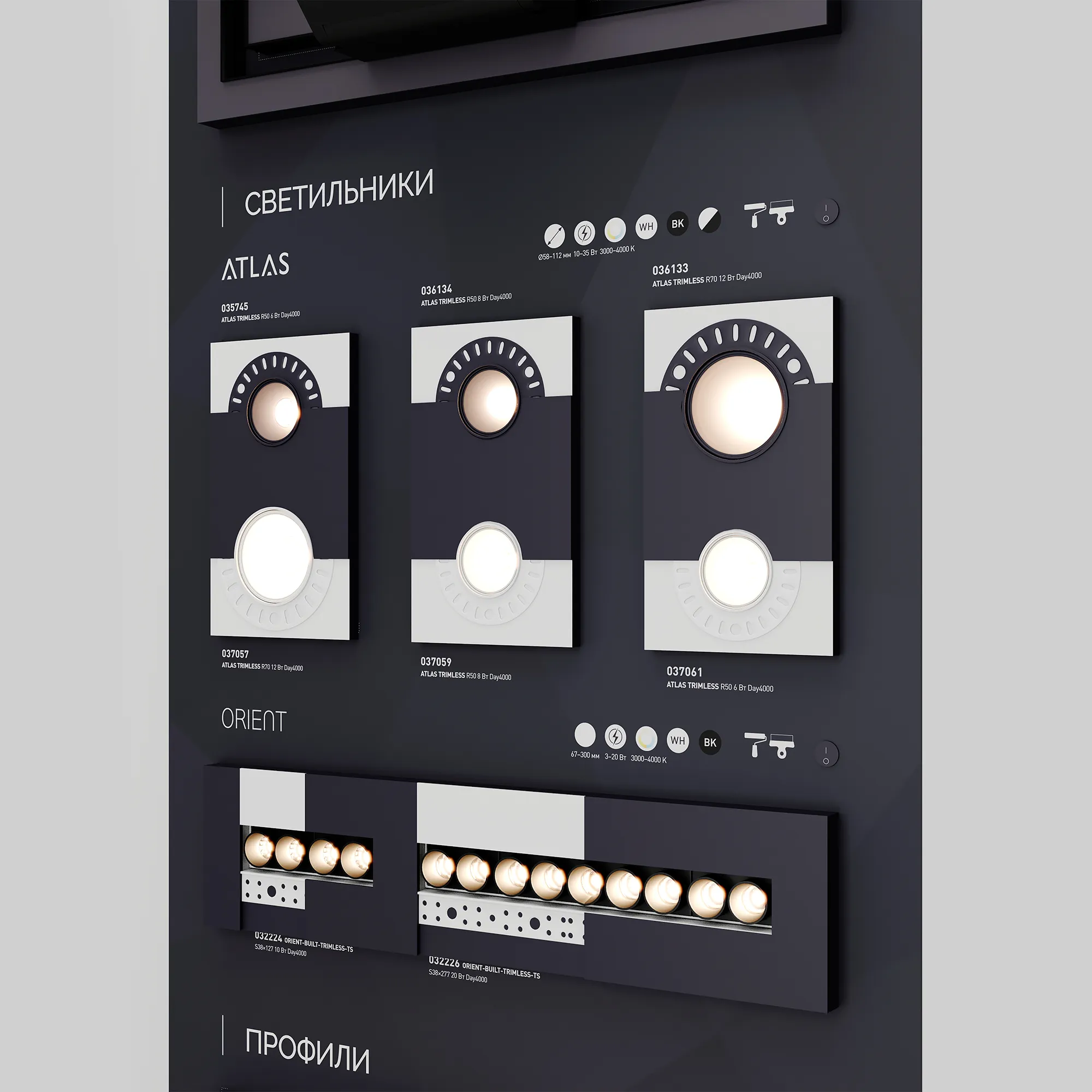 Стенд Безрамочное освещение. Включает в себя магнитные треки, светильники ATLAS, ORIENT, профили для установки под шпаклевку.