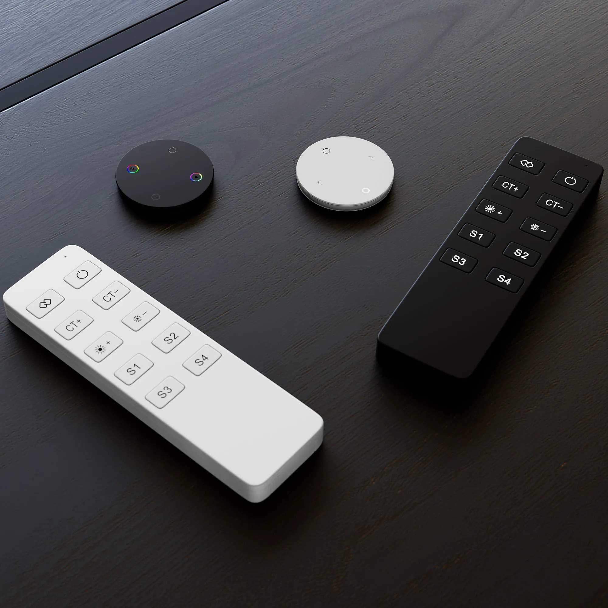 Кнопочный радиопульт ZigBee черного цвета для управления одноцветными (DIM) и мультибелыми (MIX) источниками света. 1 зона управления, 4 сцены, управление яркостью и цветовой температурой с помощью кнопок. Питание 3VDC (CR2032). Габариты 135x40x11 мм. Изготовлен из пластика с покрытием Soft Touch. Управляет устройствами ZigBee (поставляются отдельно).