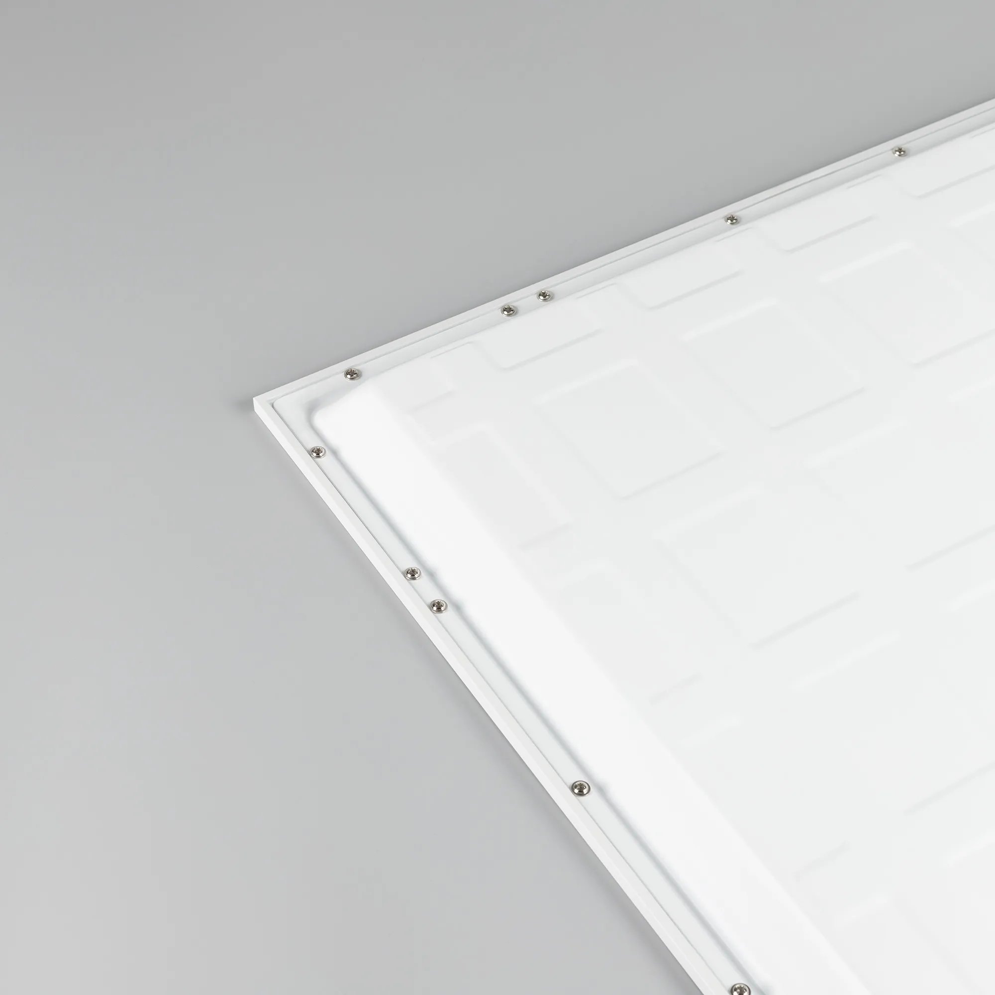 Светодиодная панель с прямой засветкой (backlit). Мощность 40 Вт, св. поток 4000 лм, 100 лм/Вт, белый 6000-6500 K, CRI>90, угол 120°, напряжение питания 230 В. Белый квадратный корпус из алюминия, экран PS, степень защиты IP54. Размер: длина 595 мм, ширина 595 мм, высота 31,3 мм. Монтаж встраиваемый, установочное отверстие длина 575 мм, ширина 575 мм. Драйвер 28-42 В, 1000 мА, пульсация <1% со степенью защиты IP65, подключение с помощью герметичного коннектора.