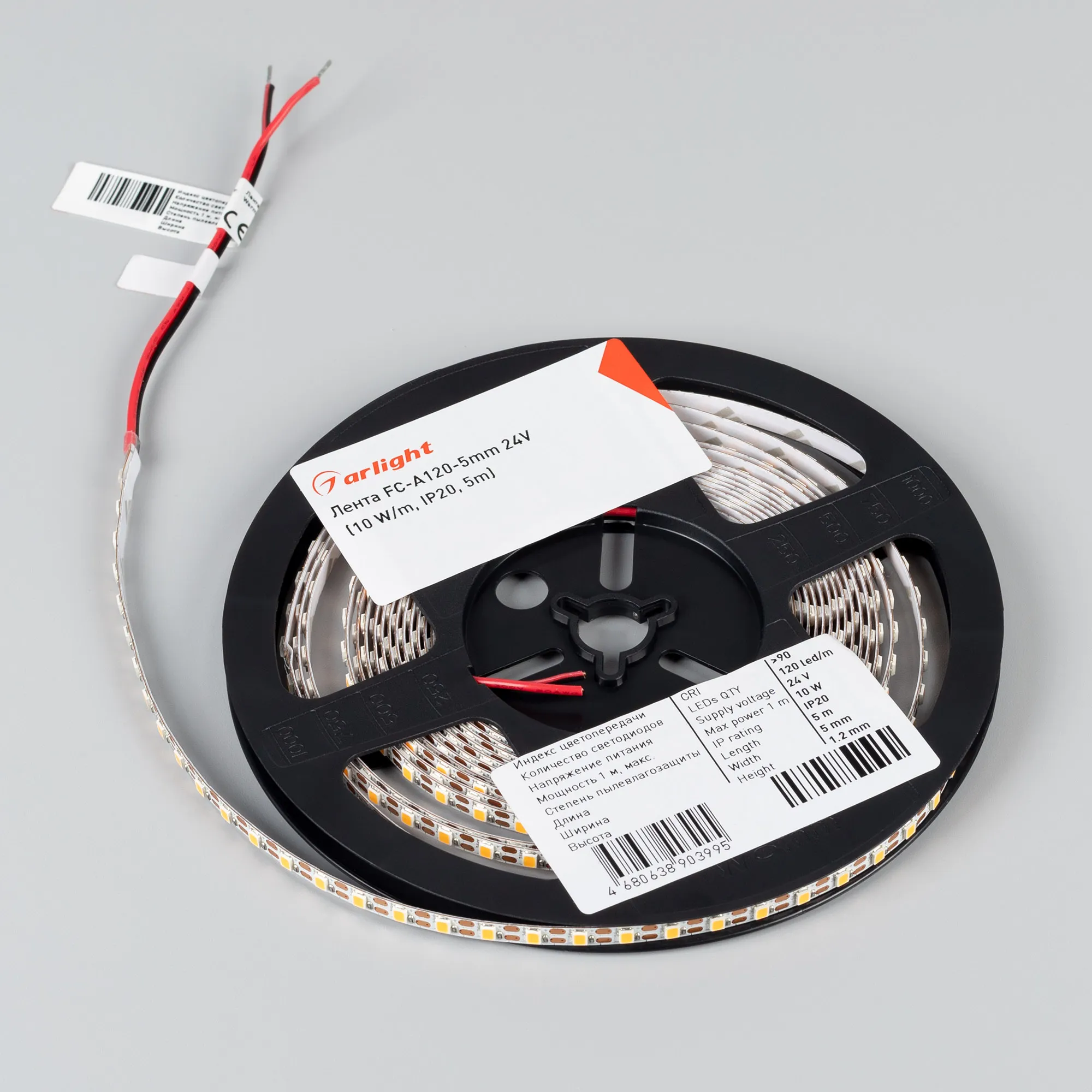 Светодиодная лента FC серии A120 с малым шагом резки. Светодиоды SMD 2835, 120 шт/м, белая плата, ширина 5 мм, скотч 3M. Цвет ТЕПЛЫЙ 2700K, индекс цветопередачи CRI>90, угол 120°. Питание 24 В, мощность 10 Вт/м (50 Вт на 5 м). Размеры 5000x5x1.2 мм. Мин. отрезок 8.33 мм, 1 светодиод. Цена за 1 м. Обязательна установка на профиль.