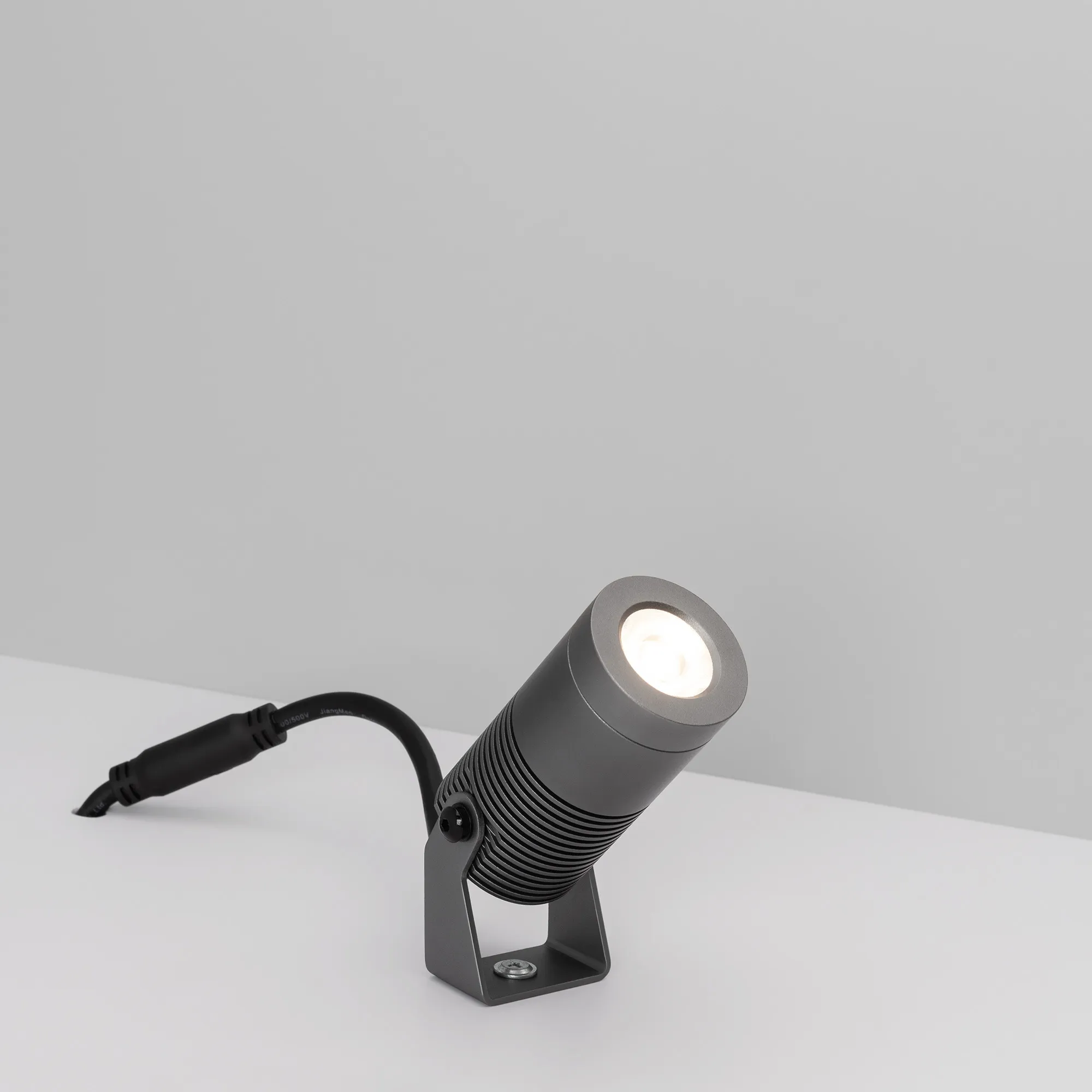 Уличный светодиодный прожектор, мощность 8Вт, угол освещения 33°. Цвет ТЕПЛЫЙ 2700К, световой поток 580лм. Влагозащищенный корпус IP67 - темно-серый алюминий, экран из закалённого стекла. Угол поворота корпуса в вертикальной плоскости 135°. Питание 230В, мощность 8 Вт. Размеры DxH -Ø44х90мм. В комплекте 1м провод.