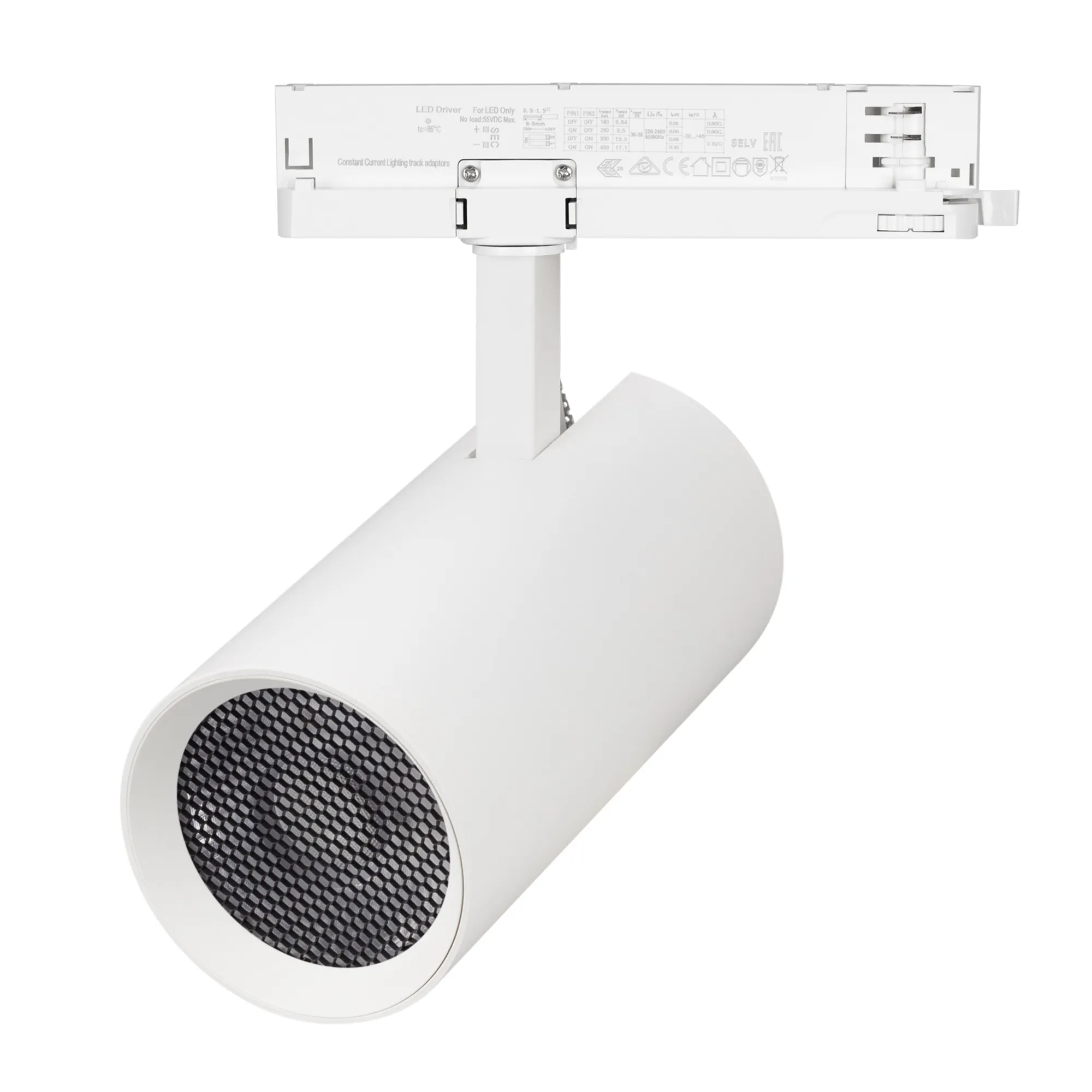 Светильник для треков/шин 4 провода. Мощность 40Вт, св. поток без решетки honeycomb 4000 лм, 100 лм/Вт, с решеткой honeycomb 2640 лм, 66 лм/Вт, дневной 4000 K, CRI>90, угол 55°, напряжение питания 230 В. Белый круглый корпус из алюминия, материал линзы PMMA, степень защиты IP20. Размер: диаметр 90 мм, длина световой части 141 мм. Монтаж на трек 3-фазный. Драйвер встроенный 24-42 В, 750мА., пульсация <5%