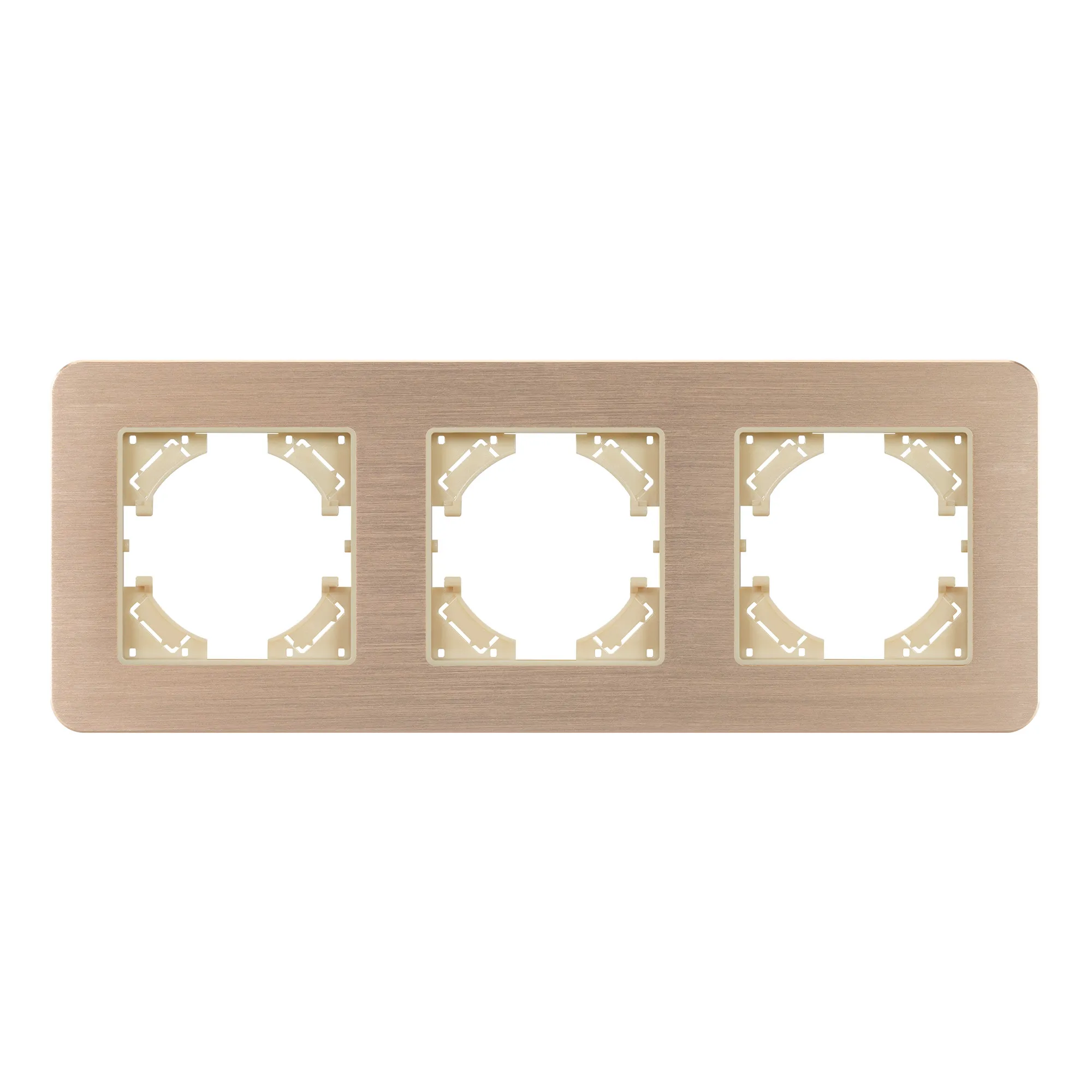 Рамка алюминиевая на 3 поста, под встраиваемый механизм. Цвет - золотой. Среднего уровня герметичности IP20. Ориентация монтажа - горизонтальная (основным ориентиром служат посадочные выступы для накладки механизма).