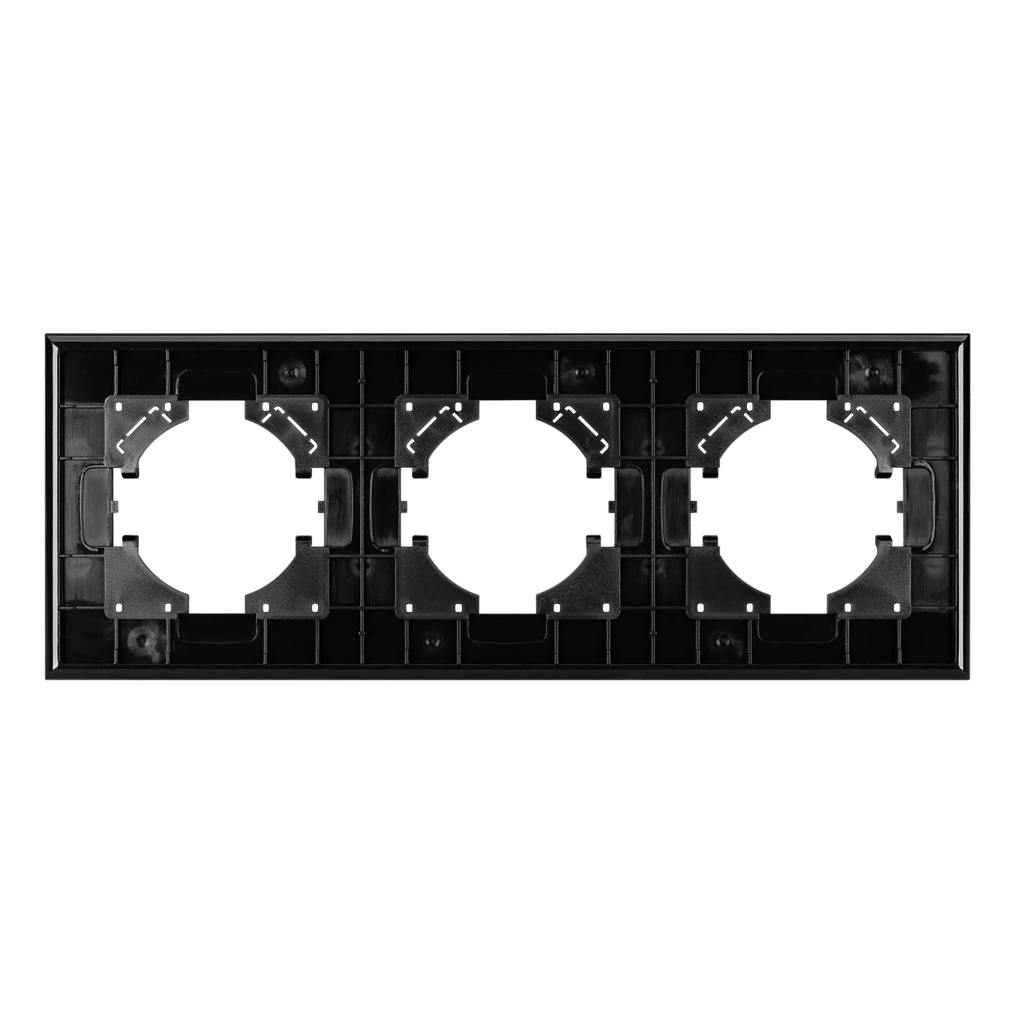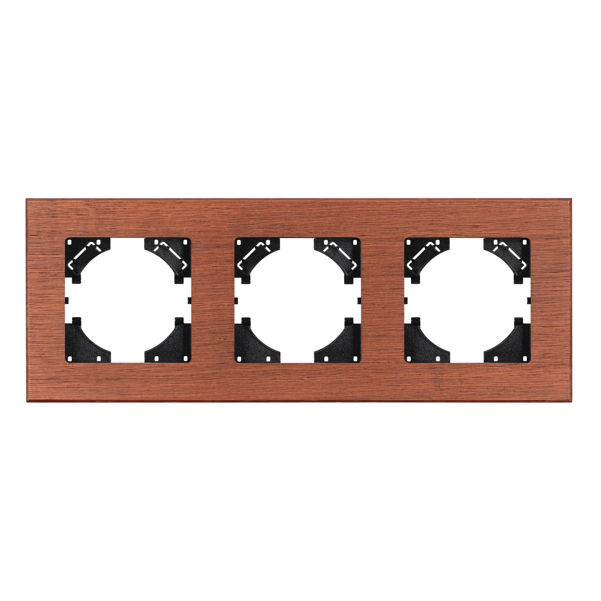 Рамка пластиковая на 3 поста, под встраиваемый механизм, с накладкой из натурального дерева. Цвет накладки - натуральное дерево*, цвет рамки - черный. Среднего уровня герметичности IP20. Ориентация монтажа - горизонтальная (основным ориентиром служат посадочные выступы для накладки механизма).