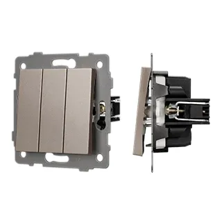 Механизм выключателя света клавишный на 1 пост 3 клавиши (непроходной). Цвет - золотой. Без фронтальной рамки. Уровень пылевлагозащиты IP20. Выключатель устанавливается в стандартный круглый подрозетник.