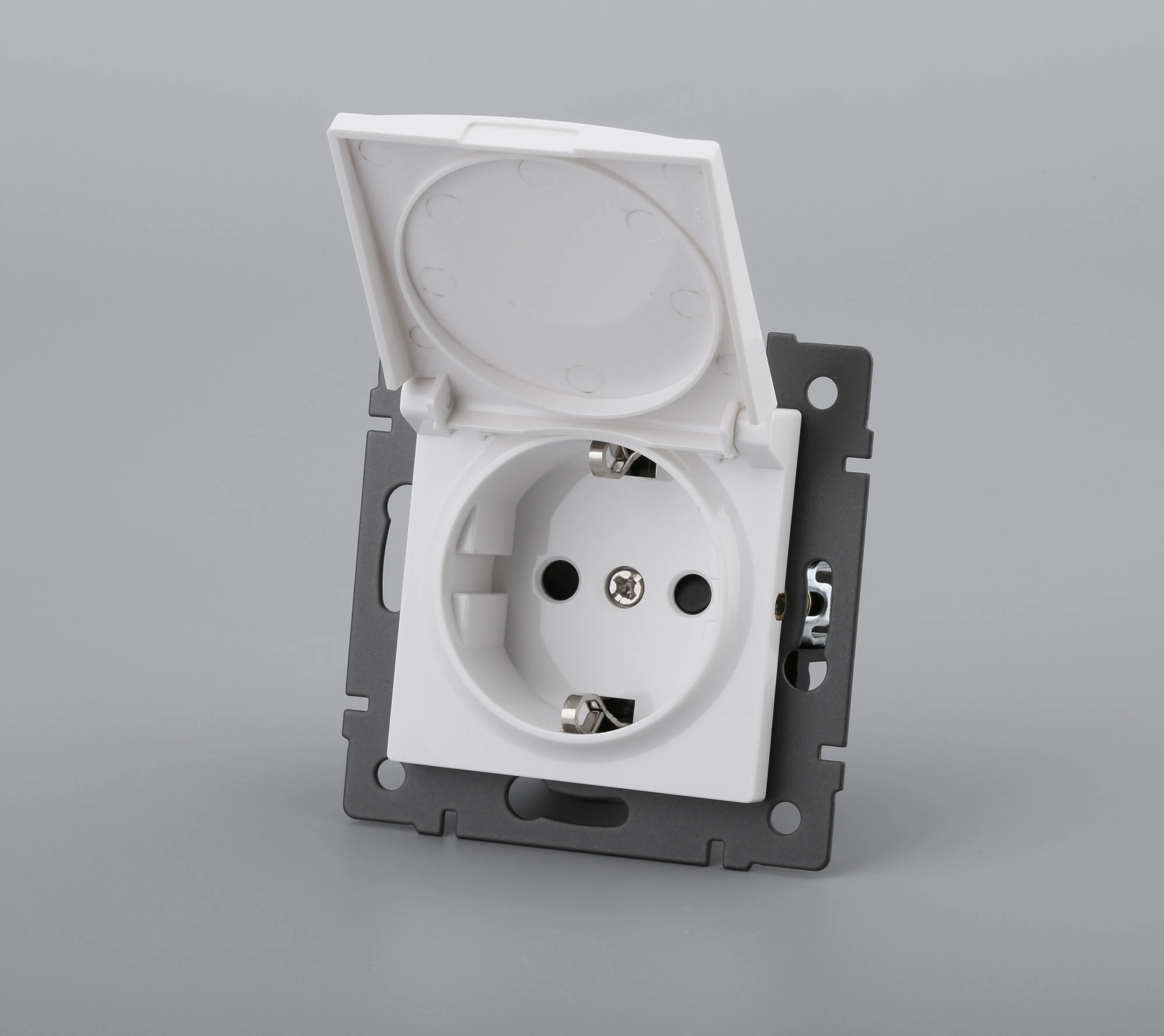 Механизм розетки с заземлением на 1 пост с влагозащитной крышкой. Цвет - белый. Без фронтальной рамки. Уровень пылевлагозащиты IP44. Устанавливается в стандартный подрозетник.