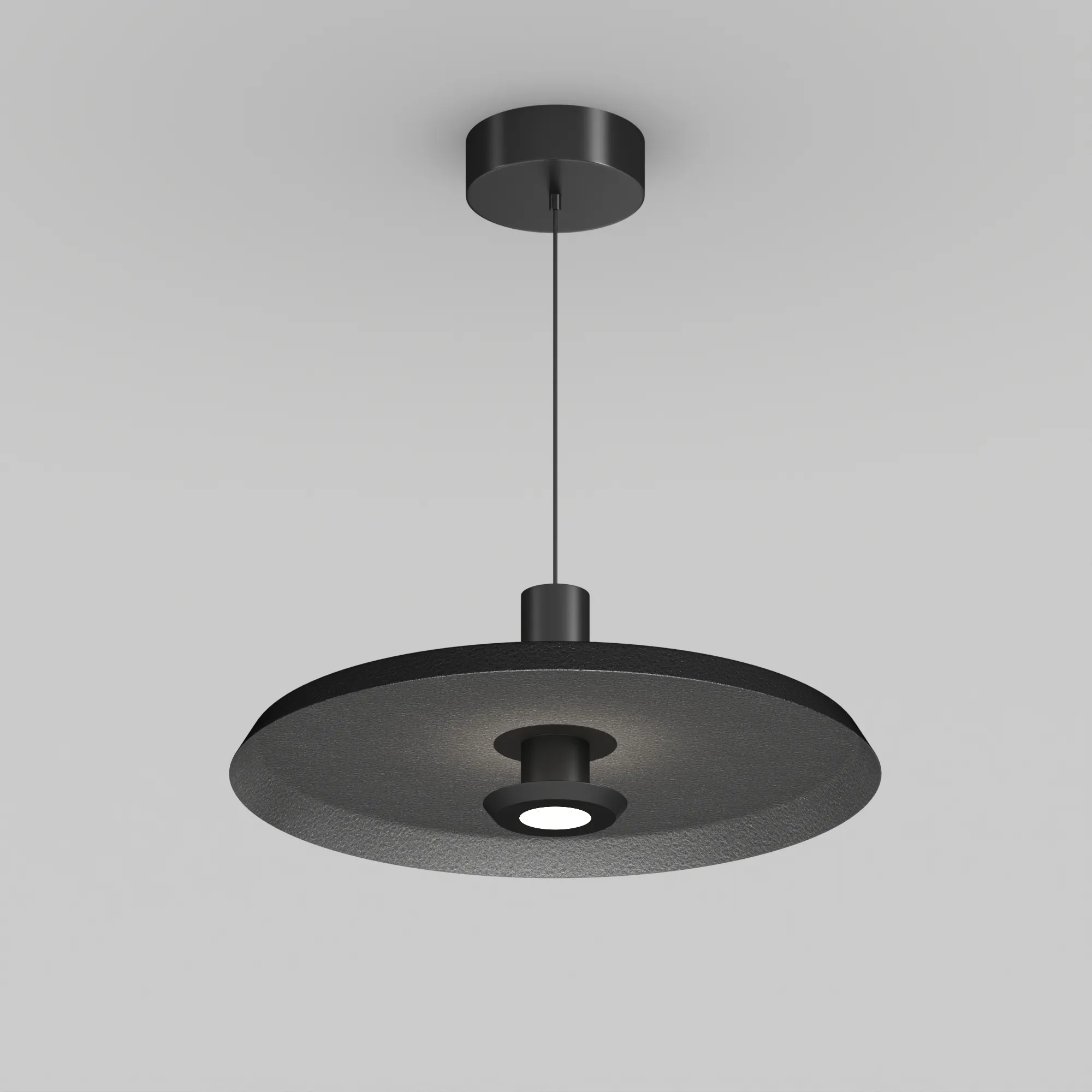 Подвесной светильник. Мощность 12 Вт, св. поток 648 лм, 64 лм/Вт, теплый 2700 K, CRI>94, угол 36°, напряжение питания 230 В. Темно-серый фигурный плафон из переработанного фетра со светло-серой внутренней поверхностью, линза-рассеиватель из PMMA, степень защиты IP20. Размер: диаметр 450 мм, высота 145 мм. Монтаж подвесной, длина подвеса 2000 мм, регулируемая. В комплекте 2 вида чаш. Габариты чаши (встраиваемая) Ø80 х 23 мм, врезное отверстие Ø60 мм. Габариты чаши (накладная) Ø120 x 35 мм. Драйвер 59В, 300 мА, пульсация <1%. Управление по TRIAC.