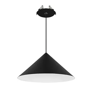 Подвесной светильник. Мощность 10 Вт, св. поток 750 лм, 75 лм/Вт, теплый 2700 K, CRI>94, угол 36°, напряжение питания 230 В. Черный корпус из алюминия в форме конуса с белой внутренней поверхностью, линза-рассеиватель из PMMA, степень защиты IP20. Размер: диаметр 240 мм, высота 110 мм. Монтаж подвесной, длина подвеса 2000 мм, регулируемая. В комплекте две чаши. Габариты чаши (встроенной) Ø80 х 41 мм, врезное отверстие Ø55 мм, габариты чаши (накладной) Ø110 х 25 мм. Драйвер 2,8-12В, 520 мА, пульсация <1%. Управление по TRIAC.