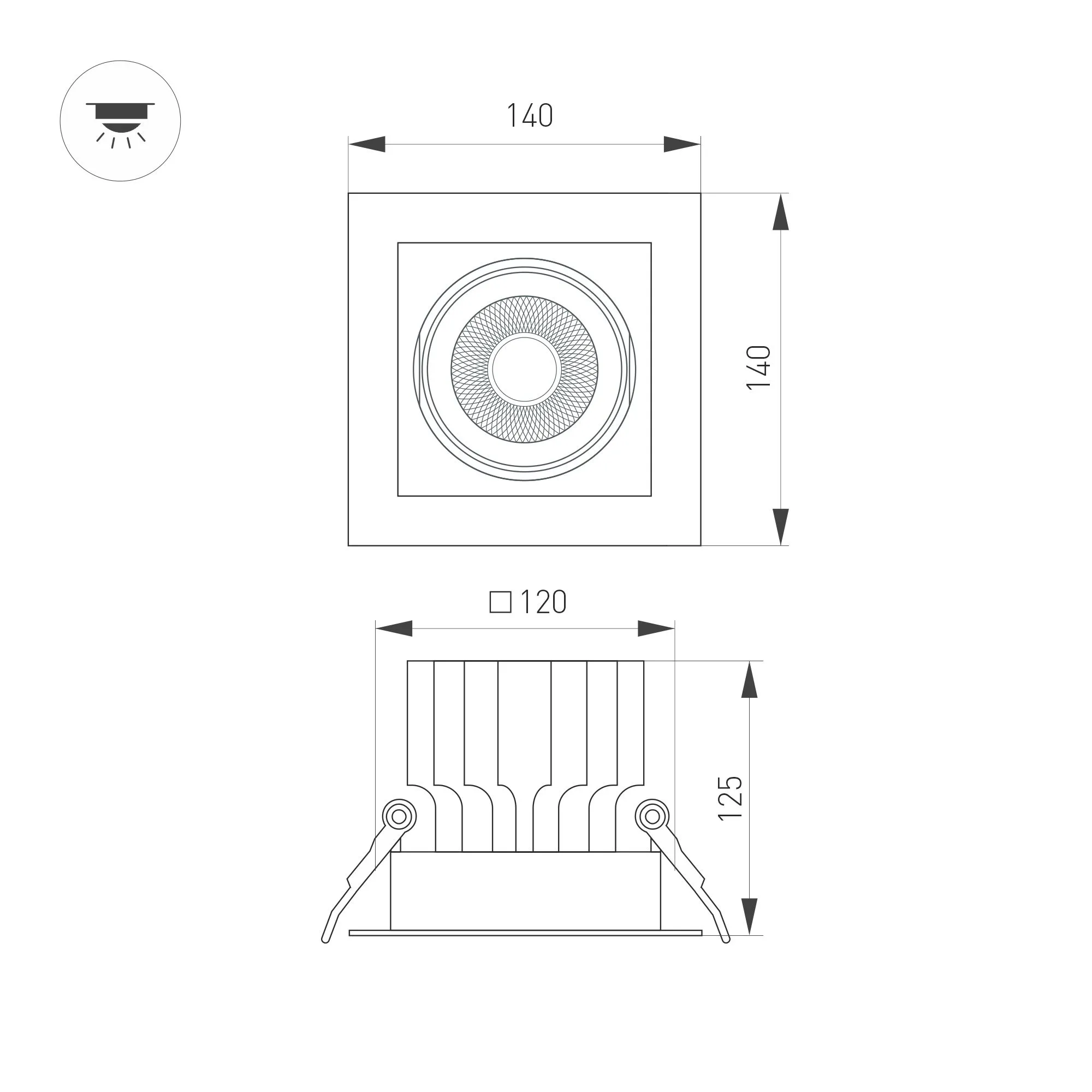 Встраиваемый карданный светильник. Мощность 30 Вт, св. поток 2650 лм, 89 лм/Вт, дневной 4000 K, CRI>92, угол 50°, напряжение питания 230 В. Белый корпус из алюминия, белая вставка, степень защиты IP20. Размер: длина 140 мм, ширина 140 мм, высота 125 мм. Монтаж встраиваемый, установочное отверстие: длина 120 мм, ширина 120 мм. Драйвер 24-42 В, 750 мА, пульсация <2%.