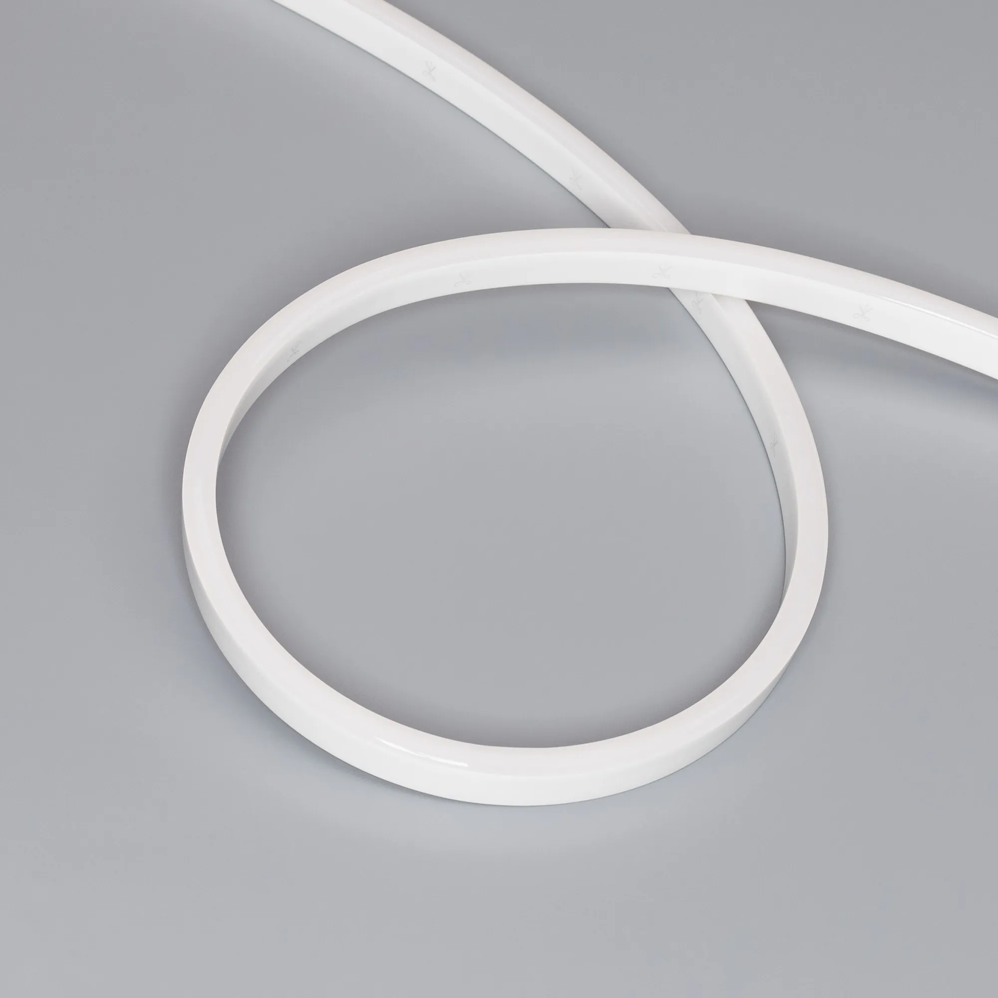 Гибкая герметичная лента (неон серии WAVE), сечение 06×12 мм. Светодиоды SMD2835 120 шт/м. Цвет свечения ТЕПЛЫЙ БЕЛЫЙ (3500 K), индекс цветопередачи CRI>90, световой поток 424 лм/м, угол излучения 125°. Мощность 8 Вт/м, питание 24 В. Оболочка из Полиуретана (PU). Класс пылевлагозащиты IP68. Размеры 1000×06×12 мм. Не подлежит резке. Горизонтальный изгиб SIDE, минимальный радиус изгиба 30 мм. Катушка 1 м. Цена за 1 м. Гарантия 3 года.