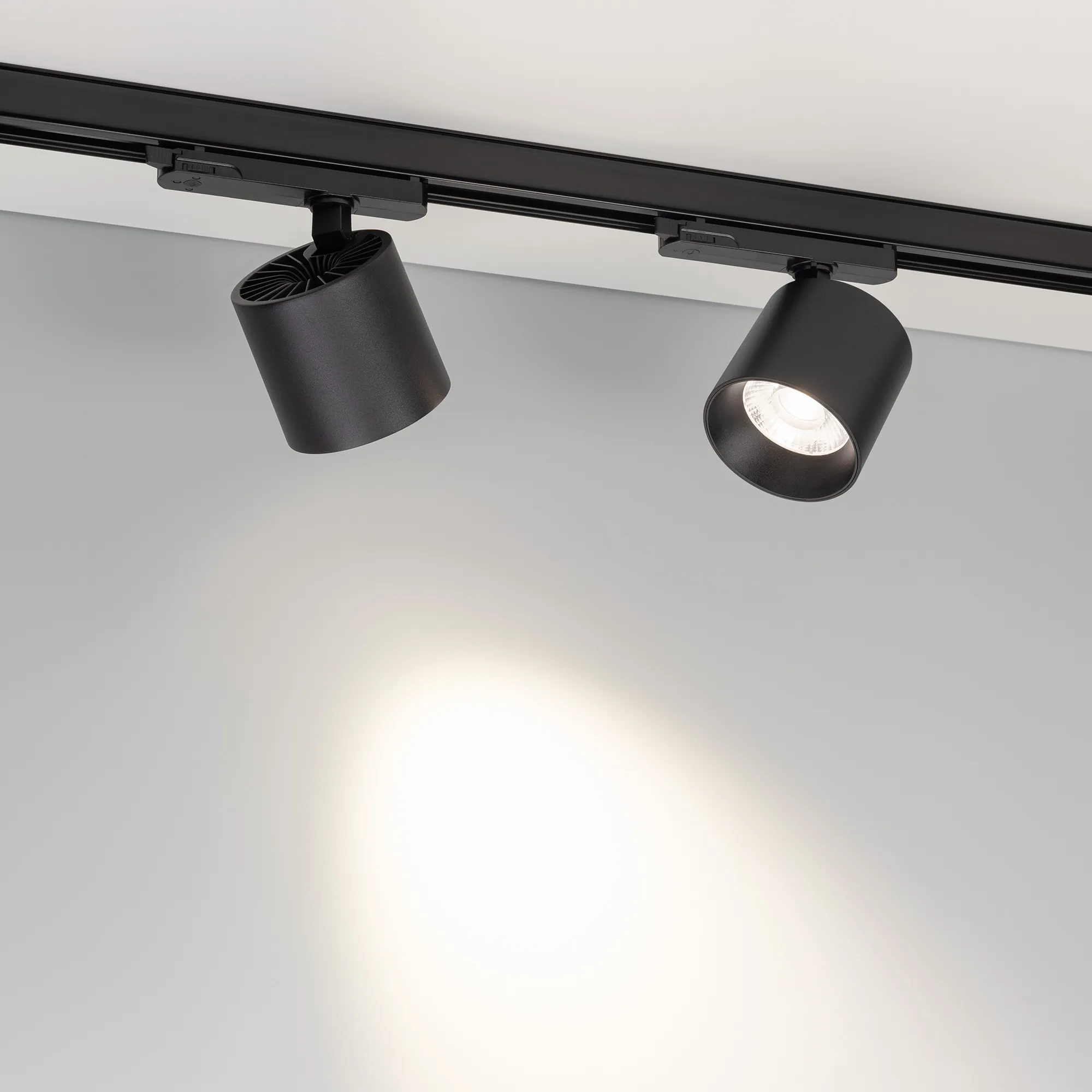 Светильник для трехфазных треков, 36 Вт с управлением TRIAC. Цвет свечения ДНЕВНОЙ 4000K, световой поток 3420 лм, угол 20°, CRI>90. Корпус круглый, металл, цвет черный, IP20. Размеры Ø100x93 мм. Входное напряжение AC220-240V. Драйвер встроенный 9-40В (300 - 1050мА), 50/60Гц, максимальная мощность 42 Вт.