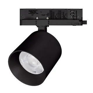 Светильник для трехфазных треков, 36 Вт с управлением TRIAC. Цвет свечения ДНЕВНОЙ 4000K, световой поток 3772 лм, угол 38°, CRI>90. Корпус круглый, металл, цвет черный, IP20. Размеры Ø100x93 мм. Входное напряжение AC220-240V. Драйвер встроенный 9-40В (300 - 1050мА), 50/60Гц, максимальная мощность 42 Вт.