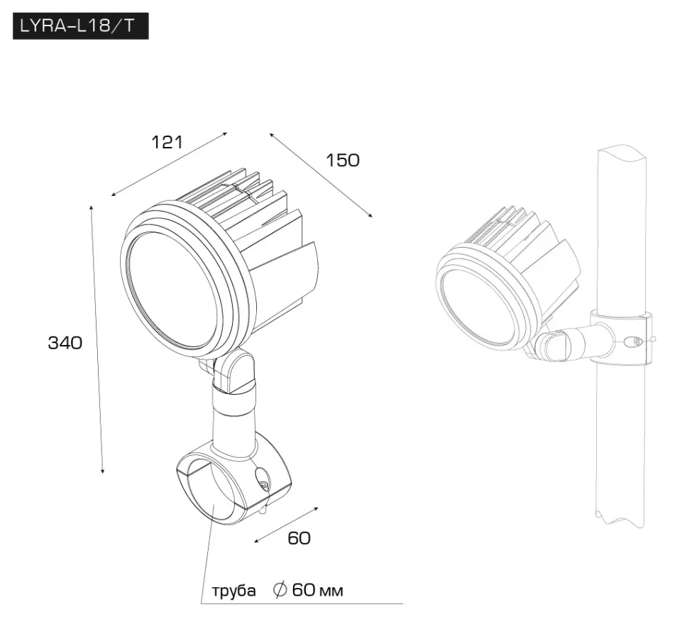 2 LYRA-L18T С креплением на трубу / 10°30°/60° 18 Вт 2610 Лм 4000K / 3000K 150*121*340 мм