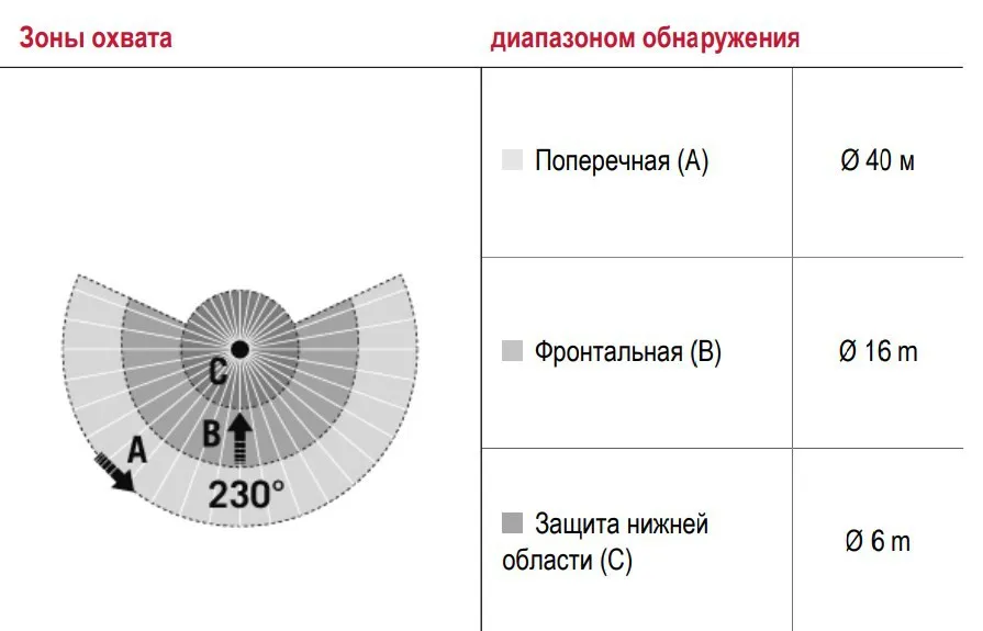 Угол обнаружения 230° (2 x 115°) + защита нижней области обнаружения 360°