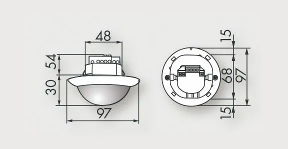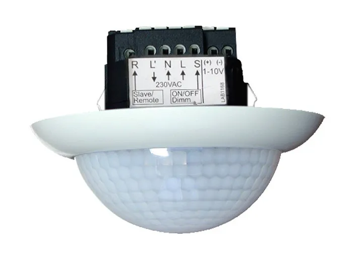 • Дистанционно управляемый потолочный датчик присутствия PD4-M-DIM в исполнении для диммирования света для потолочного монтажа, с круговым диапазоном обнаружения и дальностью действия 24 м